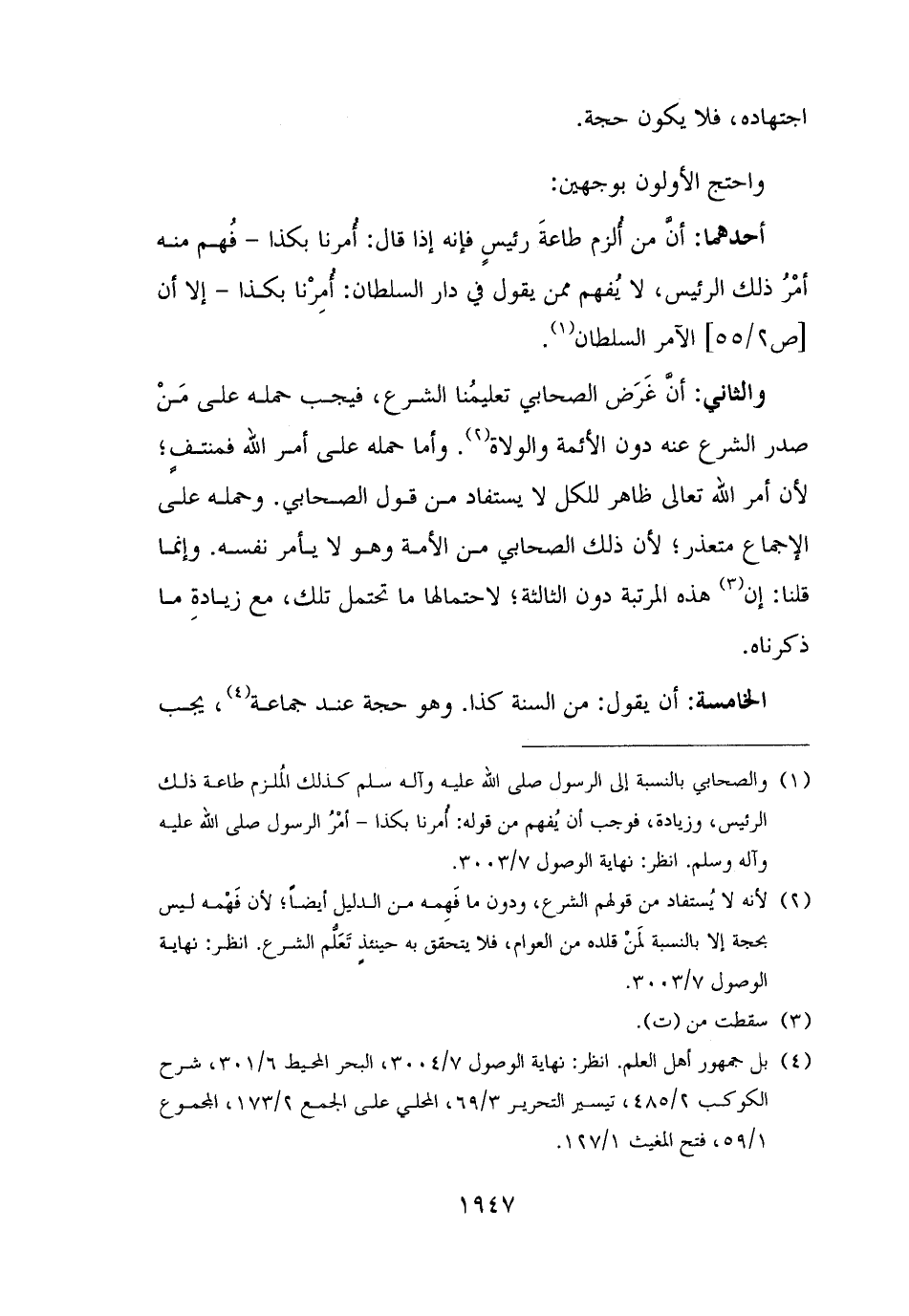 (¬١) والصحابي بالنسبة إلى الرسول صلى الله عليه وآله سلم كذلك المُلزم طاعة ذلك الرئيس، وزيادة، فوجب أن يُفهم من قوله: أمرنا بكذا - أمْرُ الرسول صلى الله عليه وآله وسلم. انظر: نهاية الوصول ٧/ ٣٠٠٣.