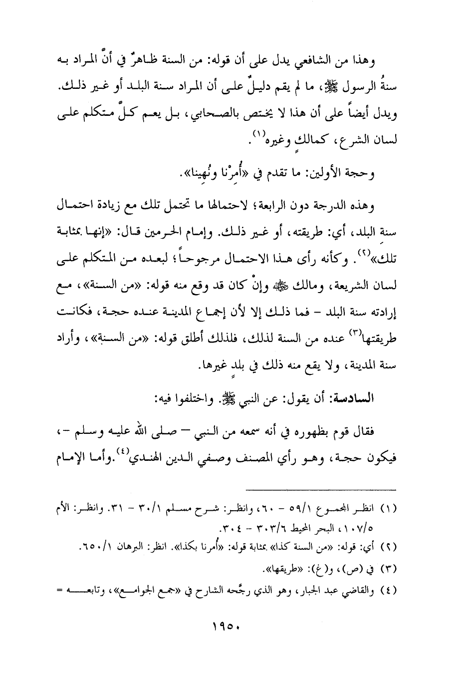 وهذه الدرجة دون الرابعة؛ لاحتمالها ما تحتمل تلك مع زيادة احتمال سنةِ البلد، أي: طريقته، أو غير ذلك. وإمام الحرمين قال: "إنها بمثابة تلك" (¬٢). وكأنه رأى هذا الاحتمال مرجوحًا؛ لبعده من المتكلم على لسان الشريعة، ومالك - رضي الله عنه - وإنْ كان قد وقع منه قوله: "من السنة"، مع إرادته سنة البلد - فما ذلك إلا لأن إجماع المدينة عنده حجة، فكانت طريقتها (¬٣) عنده من السنة لذلك، فلذلك أطلق قوله: "من السنة"، وأراد سنة المدينة، ولا يقع منه ذلك في بلدٍ غيرها.