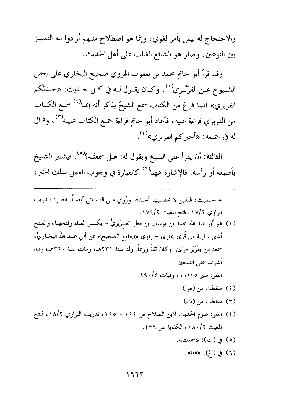 وقد قرأ أبو حاتم محمد بن يعقوب الهروي صحيح البخاري على بعض الشيوخ عن الفَرَبْرِي (¬١)، وكان يقول له في كل حديث: "حدثكم الفربري" فلما فرغ من الكتاب سمع الشيخَ يذكر أنه إنما (¬٢) سمع الكتاب من الفربري قراءة عليه، فأعاد أبو حاتم قراءة جميع الكتاب عليه (¬٣)، وقال له في جميعه: "أخبركم الفربري" (¬٤).