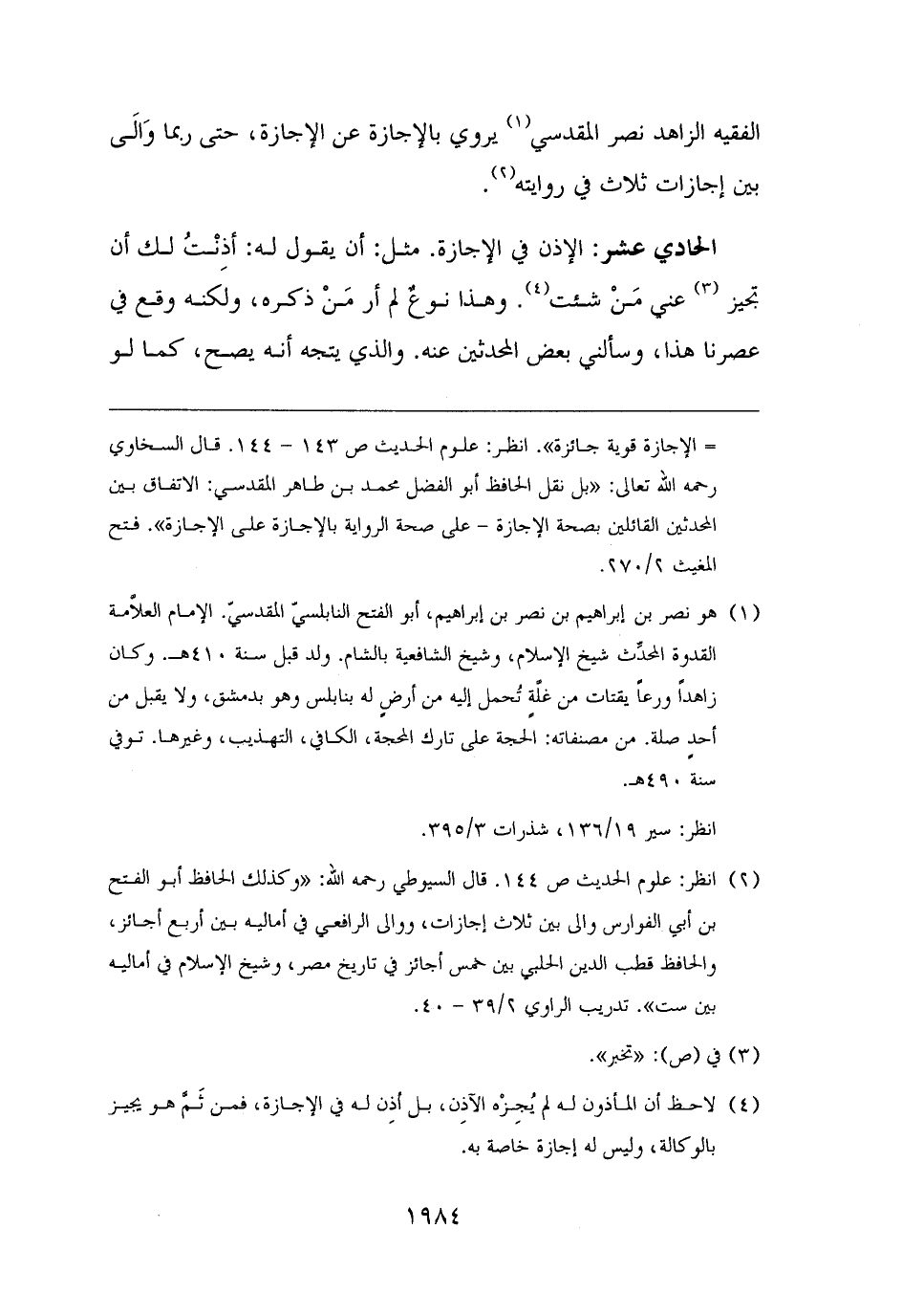 الفقيه الزاهد نصر المقدسي (¬١) يروي بالإجازة عن الإجازة، حتى ربما وَالَى بين إجازات ثلاث في روايته (¬٢).