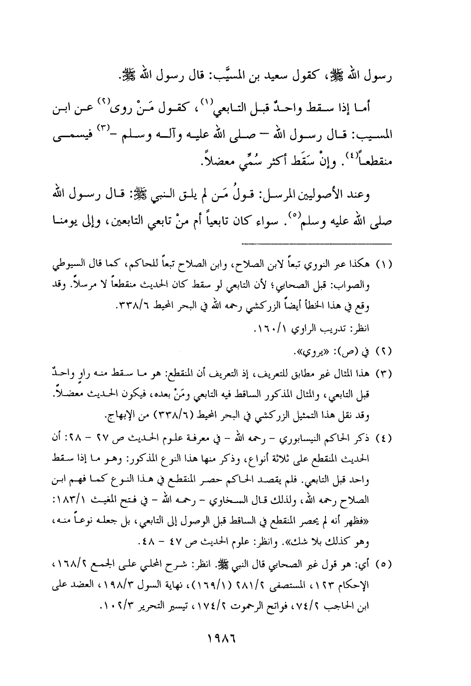 (¬١) هكذا عبر النووي تبعًا لابن الصلاح، وابن الصلاح تبعًا للحاكم، كما قال السيوطي والصواب: قبل الصحابي؛ لأن التابعي لو سقط كان الحديث منقطعًا لا مرسلًا. وقد وقع في هذا الخطأ أيضًا الزركشي رحمه الله في البحر المحيط ٦/ ٣٣٨.