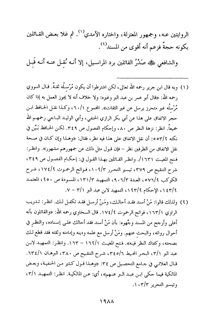 (¬١) وبه قال ابن جرير رحمه الله تعالى، لكن اشترطوا أن يكون مُرْسِلُه ثقةً. قال النووي رحمه الله: "قال أبو عمر بن عبد البر وغيره: ولا خلاف أنه لا يجوز العمل به إذا كان مُرْسِلُه غير متحرز يرسل عن غير الثقات". المجموع ١/ ٦٠، وكذا نقل الحافظ ابن حجر الاتفاق على هذا عن أبي بكر الرازي الحنفي، وأبي الوليد الباجي رحمهم الله جميعًا. انظر: نزهة النظر ص ٨٠، وإحكام الفصول ص ٣٤٩. لكن الحافظ بَيَّن في نكته ٢/ ٥٥٣: أن نقل الاتفاق على هذا فيه نظر، فقال: "وهذا وإن كان في صحة نقل الاتفاق من الطرفين نظر - فإن قبول مثل ذلك عن جمهورهم مشهور". وانظر: فتح المغيث ١٦٣١ /. وانظر القائلين بهذا القول في: إحكام الفصول ص ٣٤٩، شرح التنقيح ص ٣٧٩، تيسير التحرير ٣/ ١٠٢، فواتح الرحموت ٢/ ١٧٤، شرح الكوكب ٢/ ٥٧٦، العدة ٣/ ٩٠٦، التمهيد ٣/ ١٣١، المسودة ص ٢٥٠، المعتمد ٢/ ١٤٣، الإحكام ٢/ ١٢٣، التمهيد لابن عبد البر ١/ ٣ - ٧.