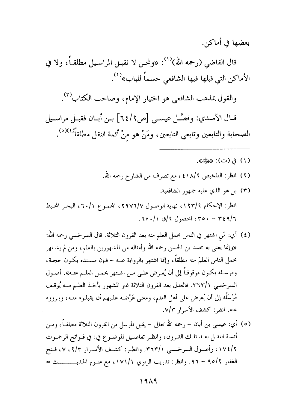 (¬٥) أي: عيسى بن أبان - رحمه الله تعالى - يقبل المرسل من القرون الثلاثة مطلقًا، ومن أئمة النقل بعد تلك القرون، وانظر تفاصيل الموضوع في: في فواتح الرحموت ٢/ ١٧٤، وأصول السرخسي ١/ ٣٦٣. وانظر: كشف الأسرار ٣/ ٢، ٧، فتح الغفار ٢/ ٩٥ - ٩٦. وانظر: تدريب الراوي ١/ ١٧١، مع علوم الحديث =