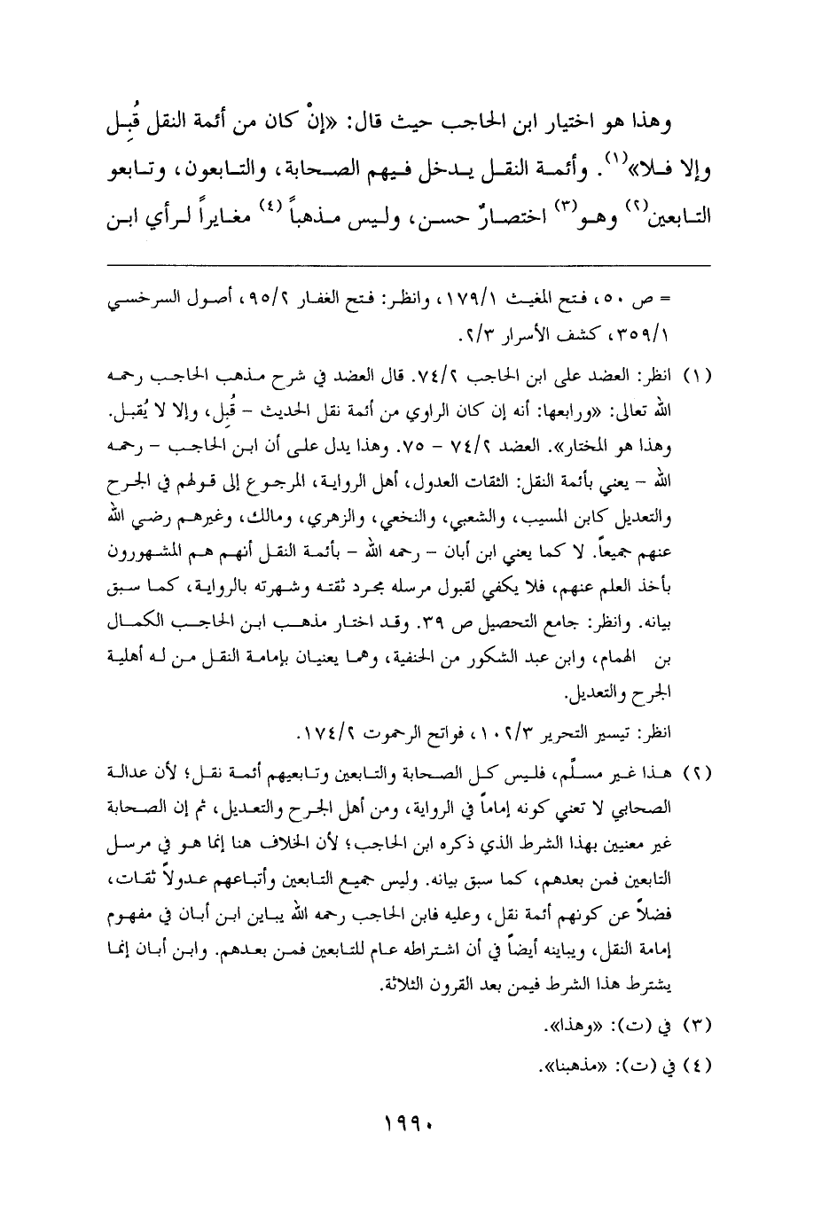 (¬٢) هذا غير مسلّم، فليس كل الصحابة والتابعين وتابعيهم أئمة نقل؛ لأن عدالة الصحابي لا تعني كونه إمامًا في الرواية، ومن أهل الجرح والتعديل، ثم إن الصحابة غير معنيين بهذا الشرط الذي ذكره ابن الحاجب؛ لأن الخلاف هنا إنما هو في مرسل التابعين فمن بعدهم، كما سبق بيانه. وليس جميع التابعين وأتباعهم عدولًا ثقات، فضلًا عن كونهم أئمة نقل، وعليه فابن الحاجب رحمه الله يباين ابن أبان في مفهوم إمامة النقل، ويباينه أيضًا في أن اشتراطه عام للتابعين فمن بعدهم. وابن أبان إنما يشترط هذا الشرط فيمن بعد القرون الثلاثة.