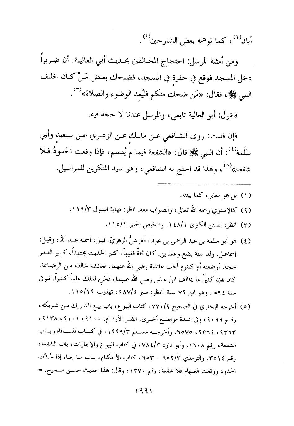 ومن أمثلة المرسل: احتجاج المخالفين بحديث أبي العالية: أن ضريرًا دخل المسجد فوقع في حفرةٍ في المسجد، فضحك بعض مَنْ كان خلف النبي - صلى الله عليه وسلم -، فقال: "مَن ضحك منكم فليُعِد الوضوء والصلاة" (¬٣).