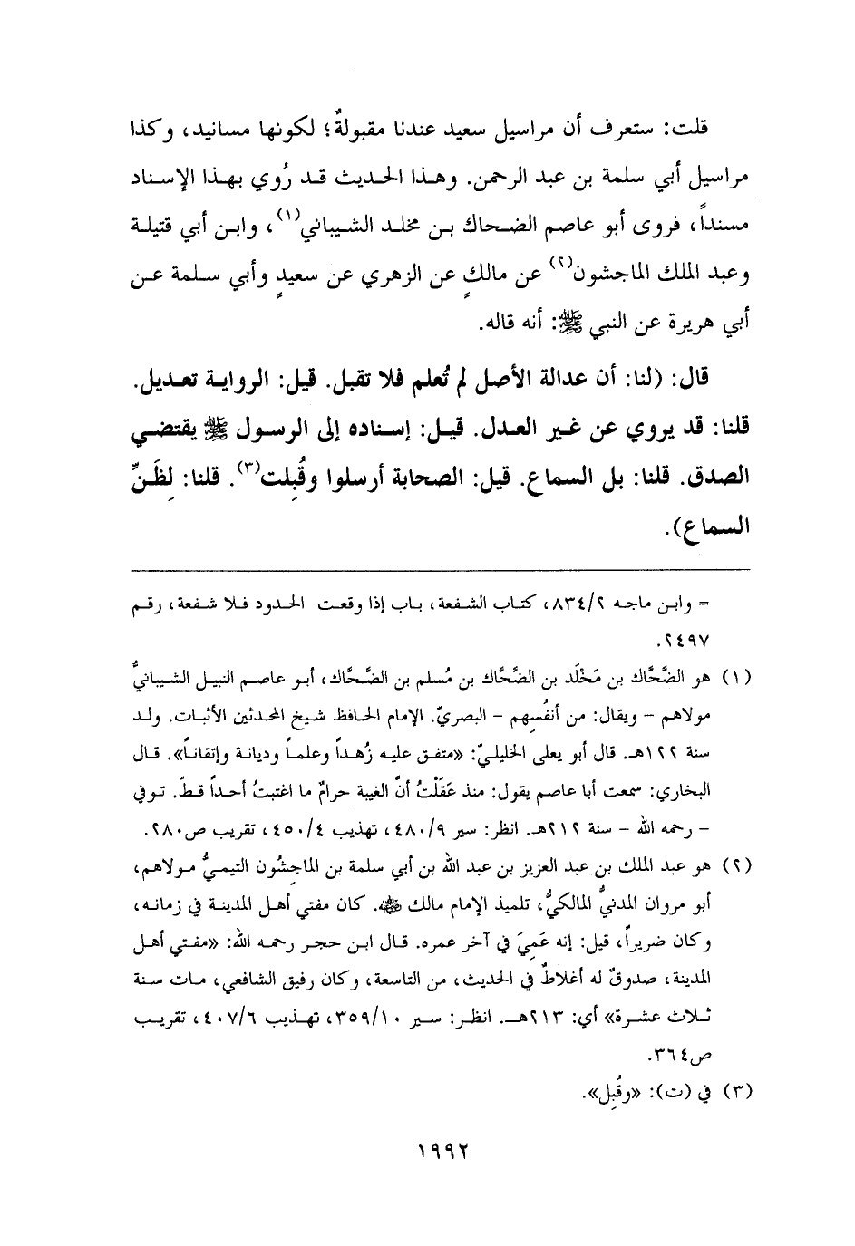 قلت: ستعرف أن مراسيل سعيد عندنا مقبولةٌ؛ لكونها مسانيد، وكذا مراسيل أبي سلمة بن عبد الرحمن. وهذا الحديث قد رُوي بهذا الإسناد مسندًا، فروى أبو عاصم الضحاك بن مخلد الشيباني (¬١)، وابن أبي قتيلة وعبد الملك الماجشون (¬٢) عن مالكٍ عن الزهري عن سعيدٍ وأبي سلمة عن أبي هريرة عن النبي - صلى الله عليه وسلم -: أنه قاله.
