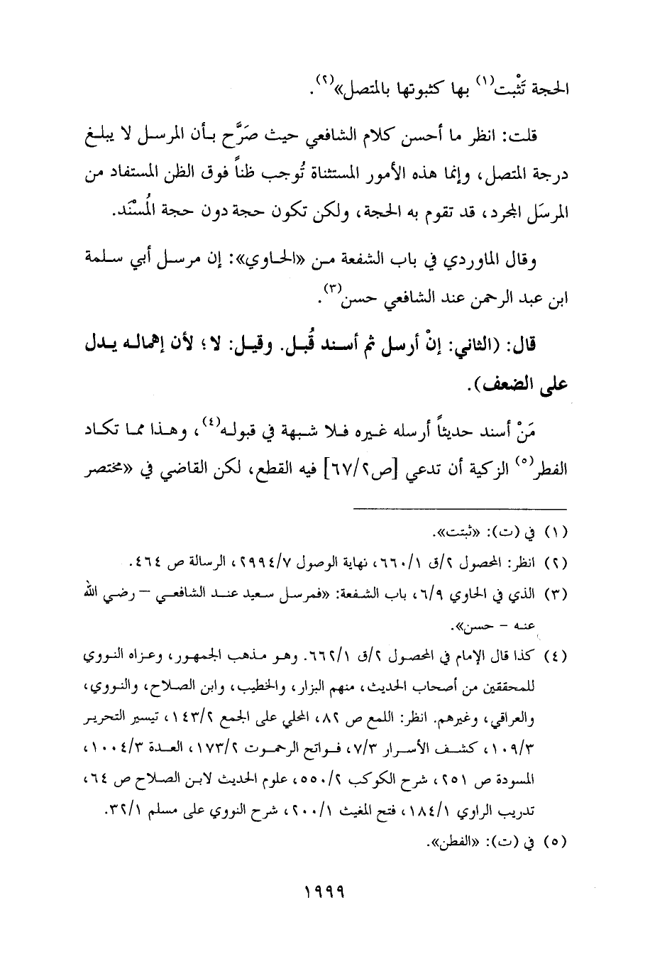 قلت: انظر ما أحسن كلام الشافعي حيث صَرَّح بأن المرسل لا يبلغ درجة المتصل، وإنما هذه الأمور المستثناة تُوجب ظنًا فوق الظن المستفاد من المرسَل المجرد، قد تقوم به الحجة، ولكن تكون حجة دون حجة المُسْنَد.