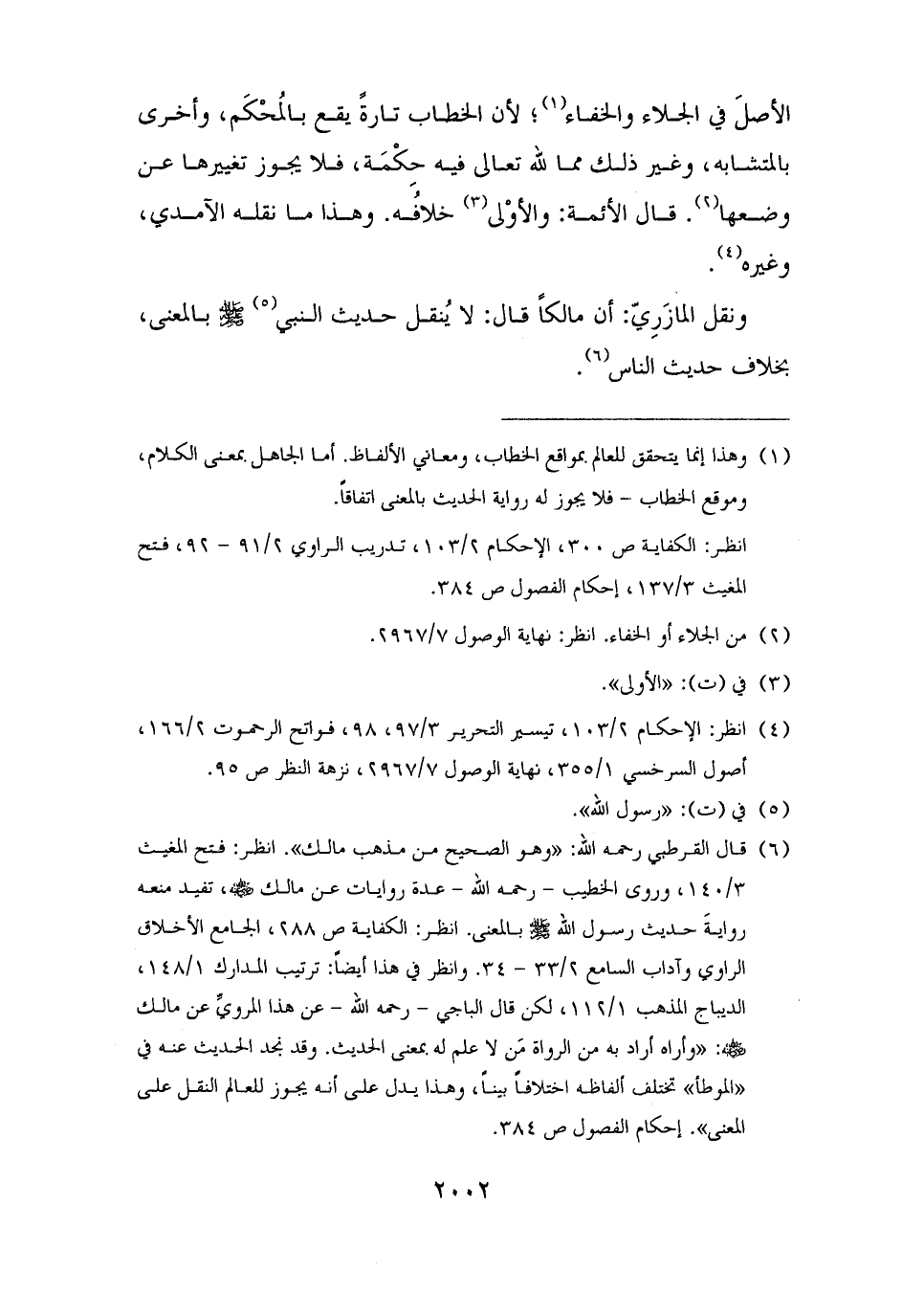 (¬٦) قال القرطبي رحمه الله: "وهو الصحيح من مذهب مالك". انظر: فتح المغيث ٣/ ١٤٠، وروى الخطيب - رحمه الله - عدة روايات عن مالك - رضي الله عنه -، تفيد منعه روايةَ حديث رسول الله - صلى الله عليه وسلم - بالمعنى. انظر: الكفاية ص ٢٨٨، الجامع الأخلاق الراوي وآداب السامع ٢/ ٣٣ - ٣٤. وانظر في هذا أيضًا: ترتيب المدارك ١/ ١٤٨، الديباج المذهب ١/ ١١٢، لكن قال الباجي - رحمه الله - عن هذا المرويِّ عن مالك - رضي الله عنه -: "وأراه أراد به من الرواة مَن لا علم له بمعنى الحديث. وقد نجد الحديث عنه في "الموطأ" تختلف ألفاظه اختلافًا بينًا، وهذا يدل على أنه يجوز للعالم النقل على المعنى". إحكام الفصول ص ٣٨٤.