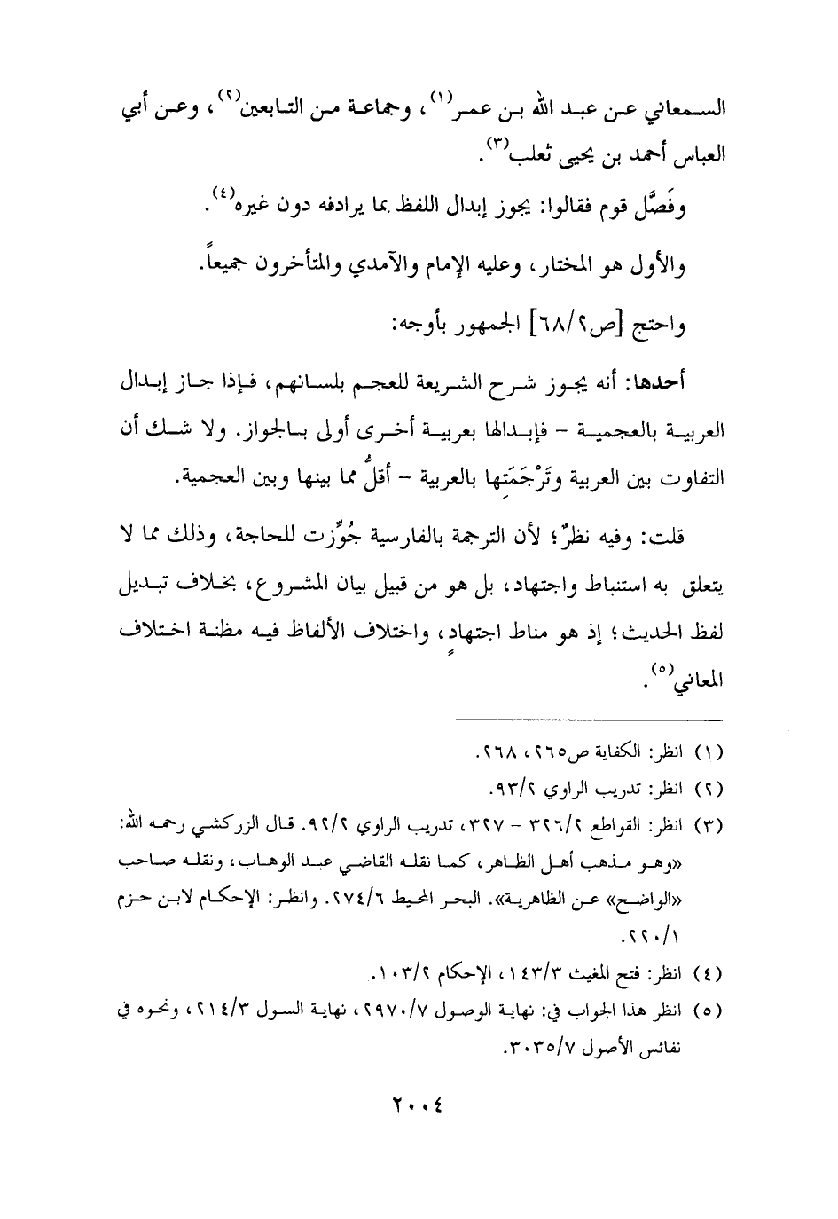أحدها: أنه يجوز شرح الشريعة للعجم بلسانهم، فإذا جاز إبدال العربية بالعجمية - فإبدالها بعربية أخرى أولى بالجواز. ولا شك أن التفاوت بين العربية وتَرْجَمَتِها بالعربية - أقلُّ مما بينها وبين العجمية.