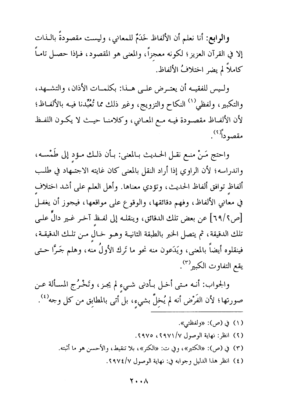 والرابع: أنا نعلم أن الألفاظ خَدَمٌ للمعاني، وليست مقصودةً بالذات إلا في القرآن العزيز؛ لكونه معجِزًا، والمعنى هو المقصود، فإذا حصل تامًا كاملًا لم يضر اختلافُ الألفاظ.