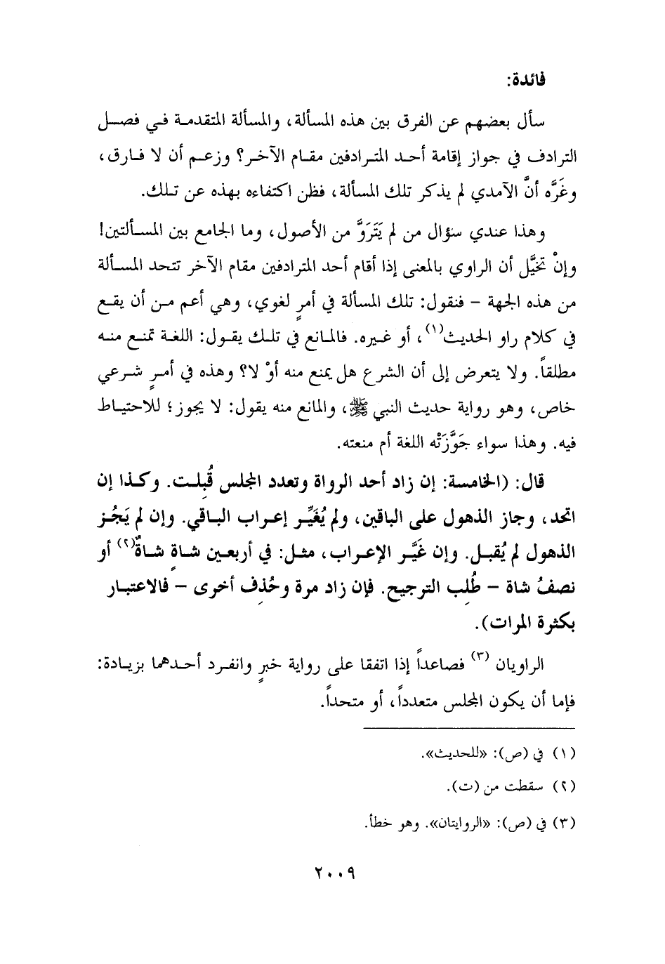 قال: (الخامسة: إن زاد أحد الرواة وتعدد المجلس قُبِلت. وكذا إن اتحد، وجاز الذهول على الباقين، ولم يُغَيِّر إعراب الباقي. وإن لم يَجُز الذهول لم يُقبل. وإن غَيَّر الإعراب، مثل: في أربعين شاةٍ شاةٌ (¬٢) أو نصفُ شاة - طُلِب الترجيح. فإن زاد مرة وحُذِف أخرى - فالاعتبار بكثرة المرات).