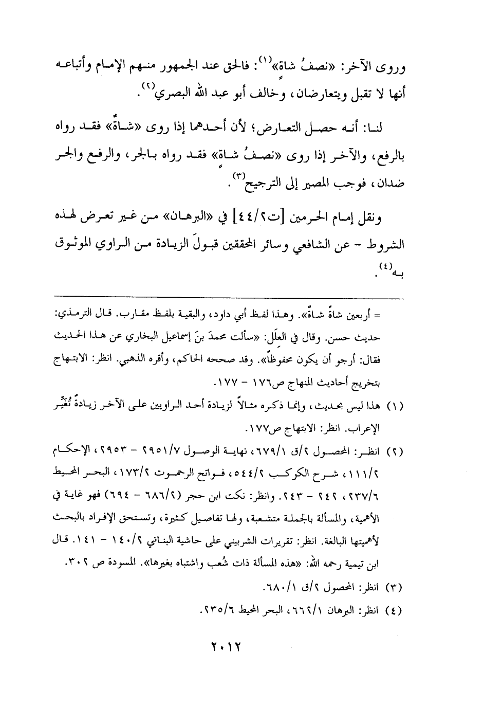 وروى الآخر: "نصفُ شاةٍ" (¬١): فالحق عند الجمهور منهم الإمام وأتباعه أنها لا تقبل ويتعارضان، وخالف أبو عبد الله البصري (¬٢).