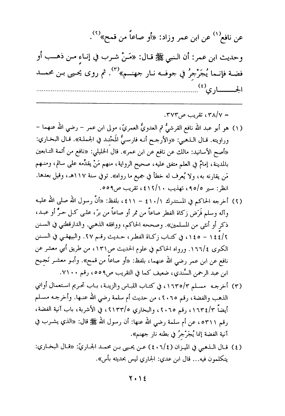 وحديث ابن عمر: أن النبي - صلى الله عليه وسلم - قال: "مَنْ شرب في إناءٍ من ذهب أو فضة فإنما يُجَرْجِرُ في جوفه نار جهنم" (¬٣). ثم روى يحيى بن محمد الجاري (¬٤). . . . . . . . . . . . . . . . . . . . . .