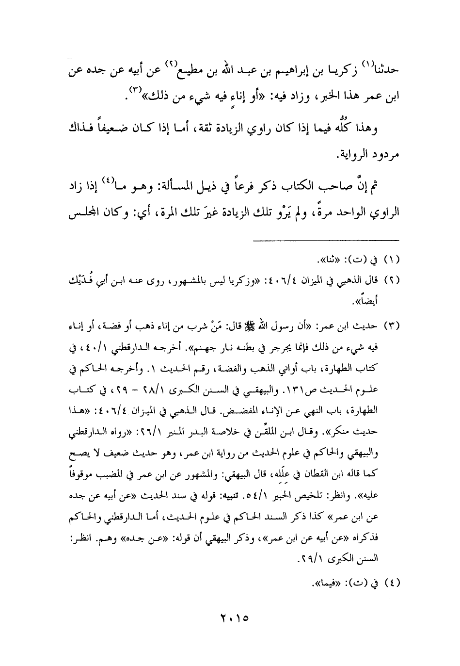 حدثنا (¬١) زكريا بن إبراهيم بن عبد الله بن مطيع (¬٢) عن أبيه عن جده عن ابن عمر هذا الخبر، وزاد فيه: "أو إناءٍ فيه شيء من ذلك" (¬٣).