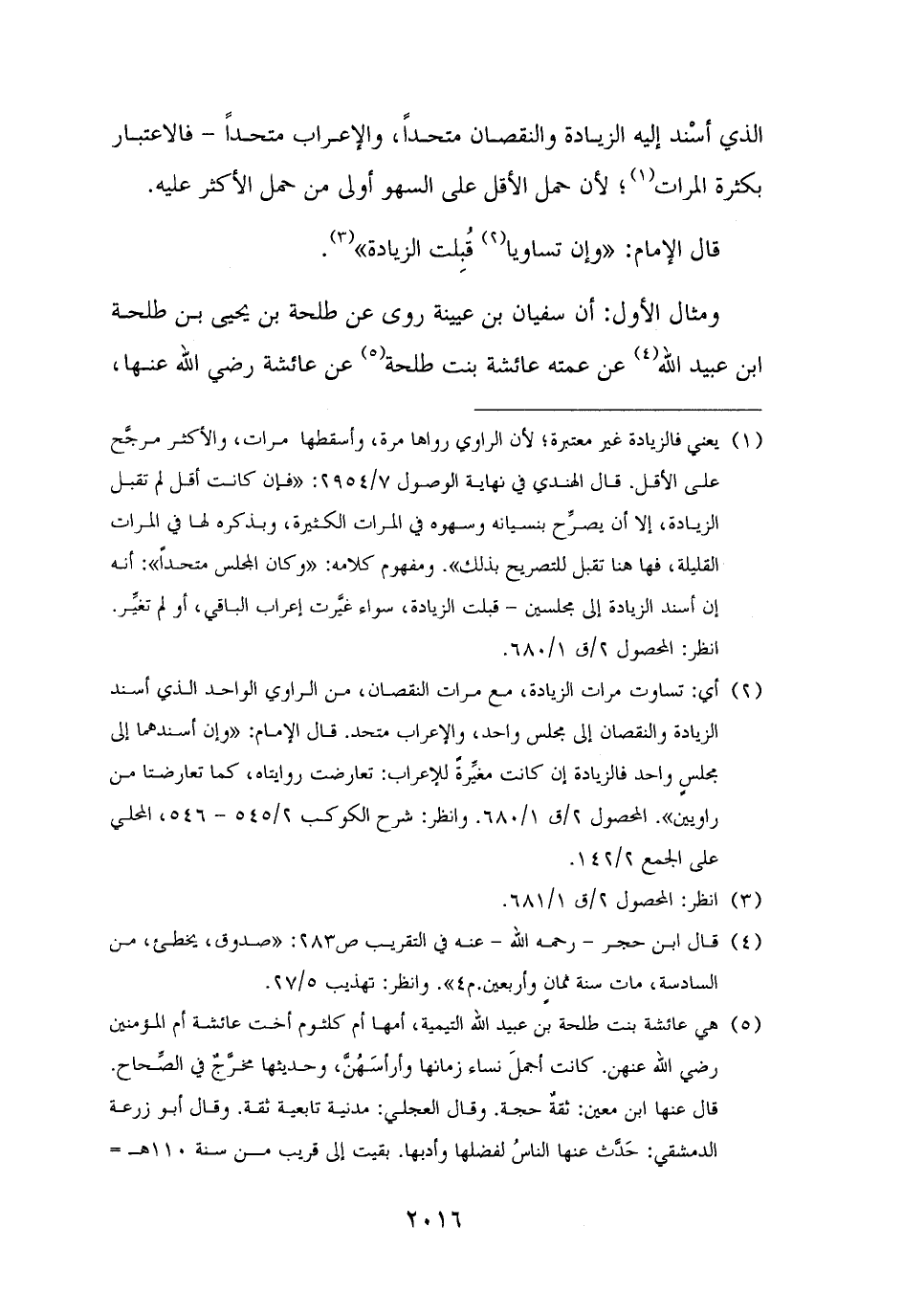 (¬٥) هي عائشة بنت طلحة بن عبيد الله التيمية، أمها أم كلثوم أخت عائشة أم المؤمنين رضي الله عنهن. كانت أجملَ نساء زمانها وأرأسَهُنَّ، وحديثها مخرَّجٌ في الصِّحاح. قال عنها ابن معين: ثقةٌ حجة. وقال العجلي: مدنية تابعية ثقة. وقال أبو زرعة الدمشقي: حَدَّث عنها الناسُ لفضلها وأدبها. بقيت إلى قريب من سنة ١١٠ هـ =