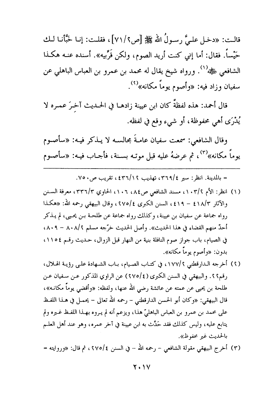(¬١) انظر: الأم ٢/ ١٠٣، مسند الشافعي ص ٨٤، ١٠٦، الحاوي ٣/ ٣٣٦، معرفة السنن والآثار ٣/ ٤١٨ - ٤١٢، السنن الكبرى ٤/ ٢٧٥، وقال البيهقي رحمه الله: "هكذا رواه جماعة عن سفيان بن عيينة، وكذلك رواه جماعة عن طلحة بن يحيى، لم يذكر أحدٌ منهم القضاء في هذا الحديث". وأصل الحديث خرّجه مسلم ٢/ ٨٠٨ - ٨٠٩، في الصيام، باب جواز صوم النافلة بنية من النهار قبل الزوال، حديث رقم ١١٥٤، بدون: "وأصوم يومًا مكانه".