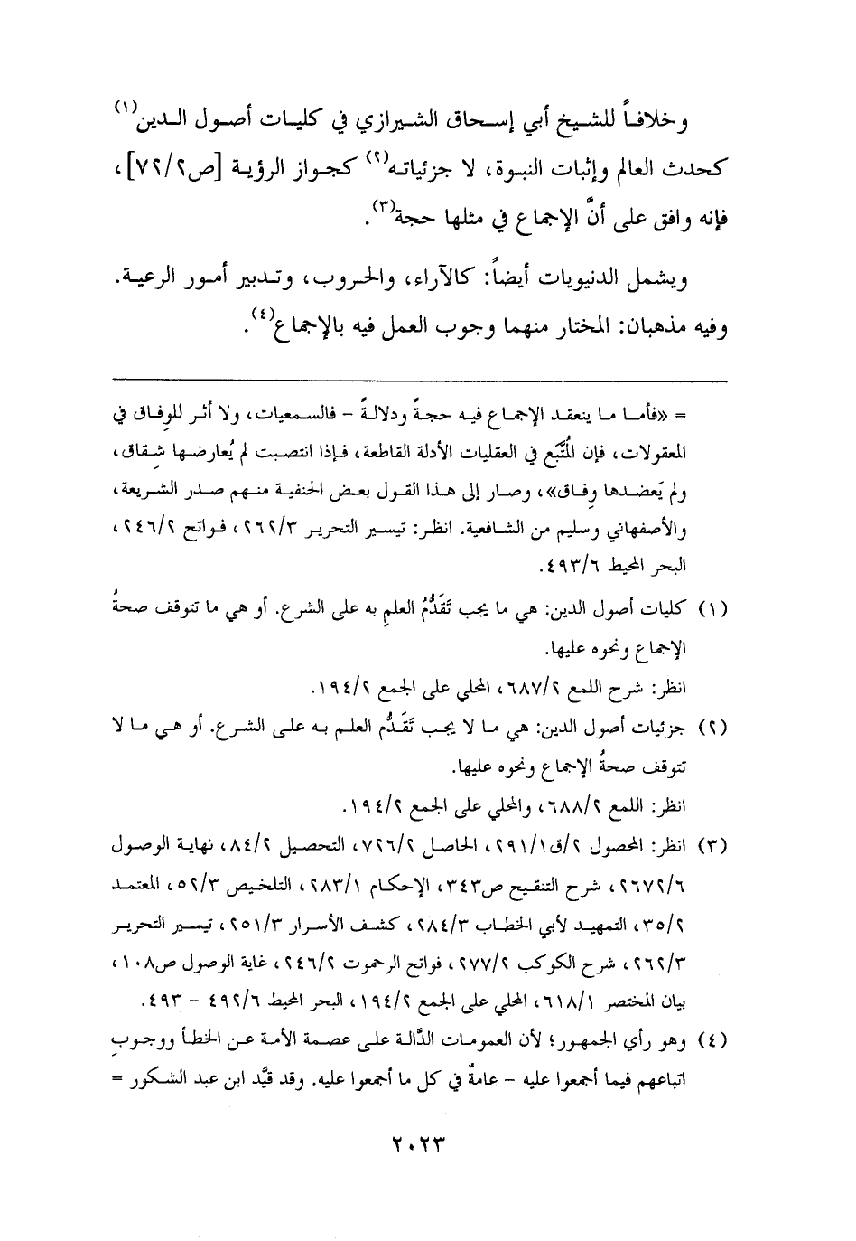 وخلافًا للشيخ أبي إسحاق الشيرازي في كليات أصول الدين (¬١) كحدث العالم وإثبات النبوة، لا جزئياته (¬٢) كجواز الرؤية، فإنه وافق على أنَّ الإجماع في مثلها حجة (¬٣).