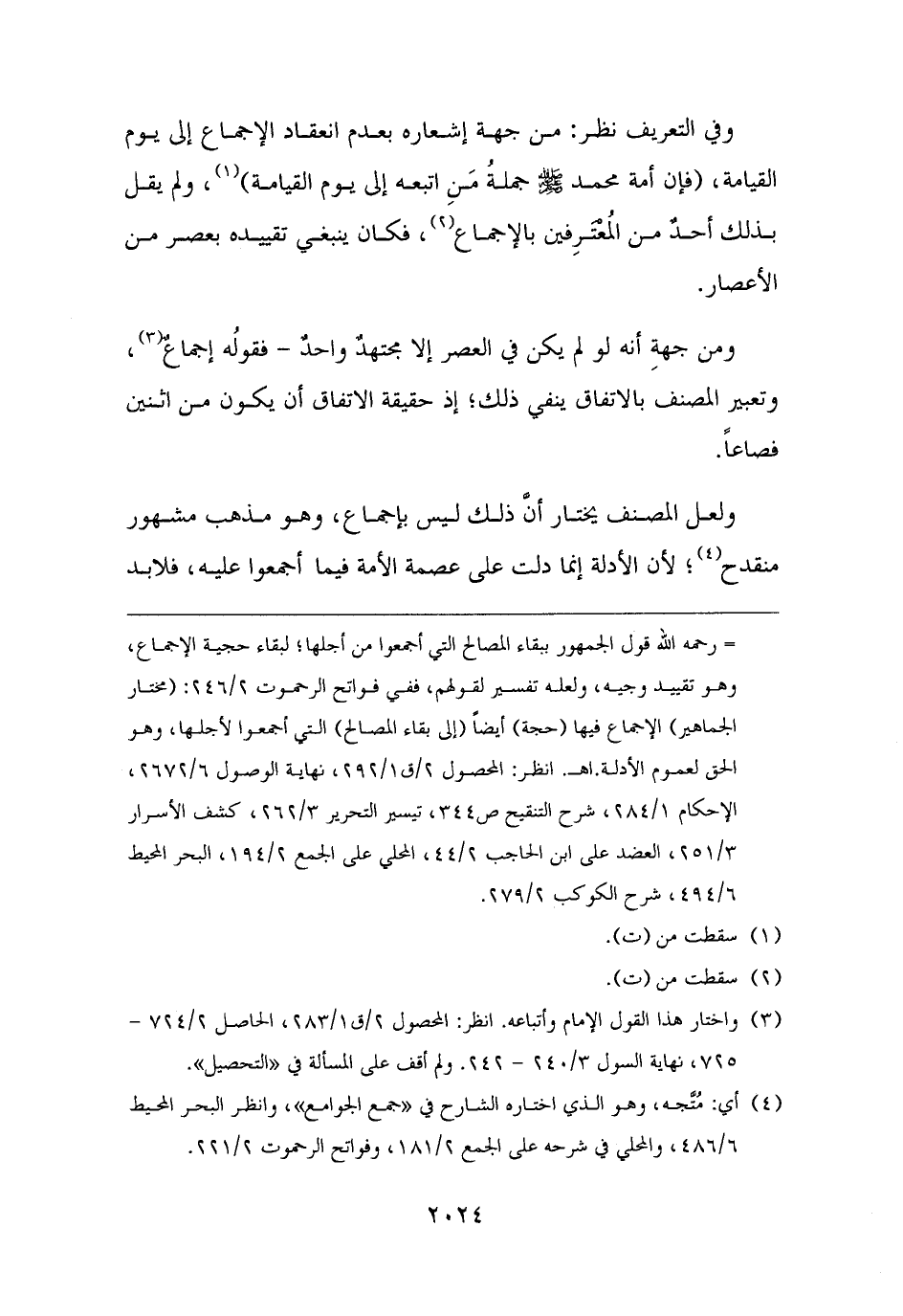 = رحمه الله قول الجمهور ببقاء المصالح التي أجمعوا من أجلها؛ لبقاء حجية الإجماع، وهو تقييد وجيه، ولعله تفسير لقولهم، ففي فواتح الرحموت ٢/ ٢٤٦: (مختار الجماهير) الإجماع فيها (حجة) أيضًا (إلى بقاء المصالح) التي أجمعوا لأجلها، وهو الحق لعموم الأدلة. اهـ. انظر: المحصول ٢/ ق ١/ ٢٩٢، نهاية الوصول ٦/ ٢٦٧٢، الإحكام ١/ ٢٨٤، شرح التنقيح ص ٣٤٤، تيسير التحرير ٣/ ٢٦٢، كشف الأسرار ٣/ ٢٥١، العضد على ابن الحاجب ٢/ ٤٤، المحلي على الجمع ٢/ ١٩٤، البحر المحيط ٦/ ٤٩٤، شرح الكوكب ٢/ ٢٧٩.