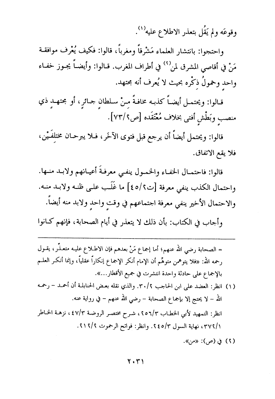 = الصحابة رضي الله عنهم؛ أما إجماع مَنْ بعدهم فإن الاطلاع عليه متعذِّر، يقول رحمه الله: "فلا يتوهمن متوهِّم أن الإمام أنكر الإجماع إنكارًا عقليًا، وإنما أنكر العلم بالإجماع على حادثة واحدة انتشرت في جميع الأقطار. . .".