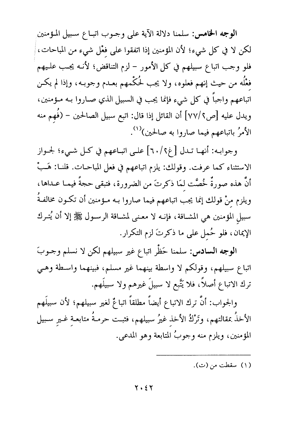 الوجه الخامس: سلمنا دلالة الآية على وجوب اتباع سبيل المؤمنين لكن لا في كل شيء؛ لأن المؤمنين إذا اتفقوا على فِعْل شيء من المباحات، فلو وجب اتباع سبيلهم في كل الأمور - لزم التناقض؛ لأنه يجب عليهم فِعْلُه من حيث إنهم فعلوه، ولا يجب لحُكْمهم بعدم وجوبه، وإذا لم يكن اتباعهم واجبًا في كل شيء فإنما يجب في السبيل الذي صاروا به مؤمنين، ويدل عليه أن القائل إذا قال: اتبع سبيل الصالحين - (فُهِم منه الأمرُ باتباعهم فيما صاروا به صالحين) (¬١).