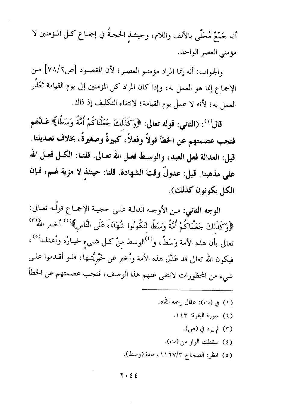 قال (¬١): (الثاني: قوله تعالى: {وَكَذَلِكَ جَعَلْنَاكُمْ أُمَّةً وَسَطًا} عَدَّلهم فتجب عصمتهم عن الخطأ قولًا وفعلًا، كبيرةً وصغيرةً، بخلاف تعديلنا. قيل: العدالة فعل العبد، والوسط فعل الله تعالى. قلنا: الكل فعل الله على مذهبنا. قيل: عدولٌ وقتَ الشهادة. قلنا: حينئذٍ لا مزية لهم، فإن الكل يكونون كذلك).