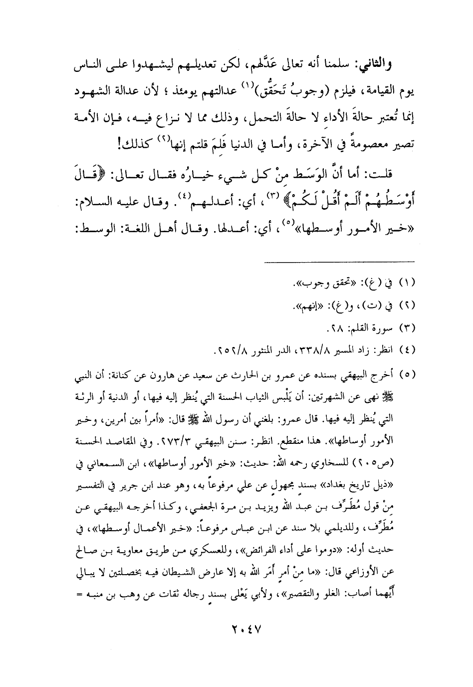 (¬٥) أخرج البيهقي بسنده عن عمرو بن الحارث عن سعيد عن هارون عن كنانة: أن النبي - صلى الله عليه وسلم - نهى عن الشهرتين: أن يَلْبس الثياب الحسنة التي يُنظر إليه فيها، أو الدنية أو الرئة التي يُنظر إليه فيها. قال عمرو: بلغني أن رسول الله - صلى الله عليه وسلم - قال: "أمرًا بين أمرين، وخير الأمور أوساطها". هذا منقطع. انظر: سنن البيهقي ٣/ ٢٧٣. وفي المقاصد الحسنة (ص ٢٠٥) للسخاوي رحمه الله: حديث: "خير الأمور أوساطها"، ابن السمعاني في "ذيل تاريخ بغداد" بسندٍ مجهولٍ عن علي مرفوعًا به، وهو عند ابن جرير في التفسير مِنْ قول مُطَرِّف بن عبد الله ويزيد بن مرة الجعفي، وكذا أخرجه البيهقي عن مُطَرِّف، وللديلمي بلا سند عن ابن عباس مرفوعًا: "خير الأعمال أوسطها"، في حديث أوله: "دوموا على أداء الفرائض"، وللعسكري من طريق معاوية بن صالح عن الأوزاعي قال: "ما مِنْ أمرٍ أمَر الله به إلا عارض الشيطان فيه بخصلتين لا يبالي أيَّهما أصاب: الغلو والتقصير"، ولأبي يَعْلى بسندٍ رجاله ثقات عن وهب بن منبه =