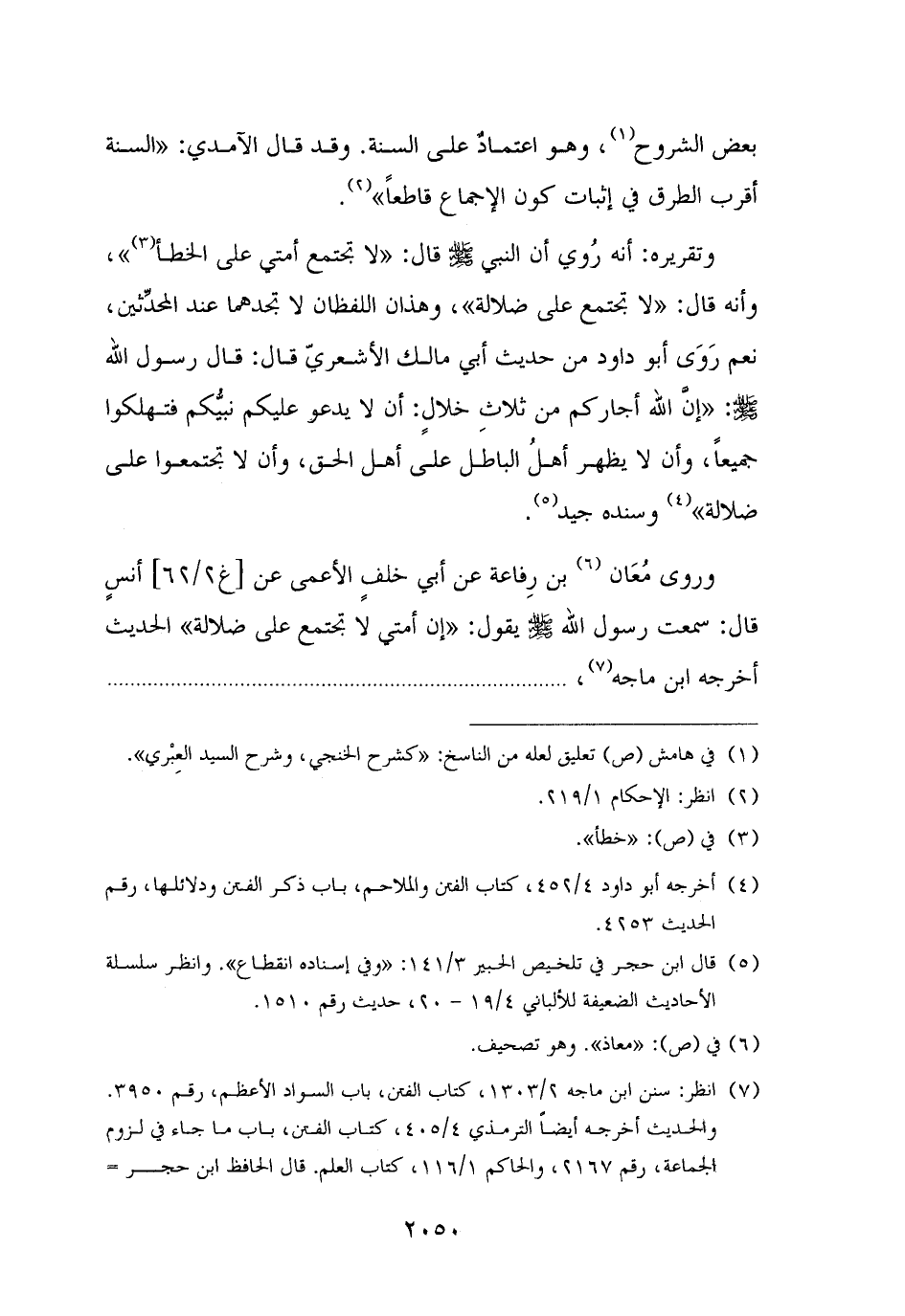 وتقريره: أنه رُوي أن النبي - صلى الله عليه وسلم - قال: "لا تجتمع أمتي على الخطأ (¬٣) "، وأنه قال: "لا تجتمع على ضلالة"، وهذان اللفظان لا تجدهما عند المحدِّثين، نعم رَوَى أبو داود من حديث أبي مالك الأشعريّ قال: قال رسول الله - صلى الله عليه وسلم -: "إن الله أجاركم من ثلاثِ خلالٍ: أن لا يدعو عليكم نبيُّكم فتهلكوا جميعًا، وأن لا يظهر أهلُ الباطل على أهل الحق، وأن لا تجتمعوا على ضلالة" (¬٤) وسنده جيد (¬٥).