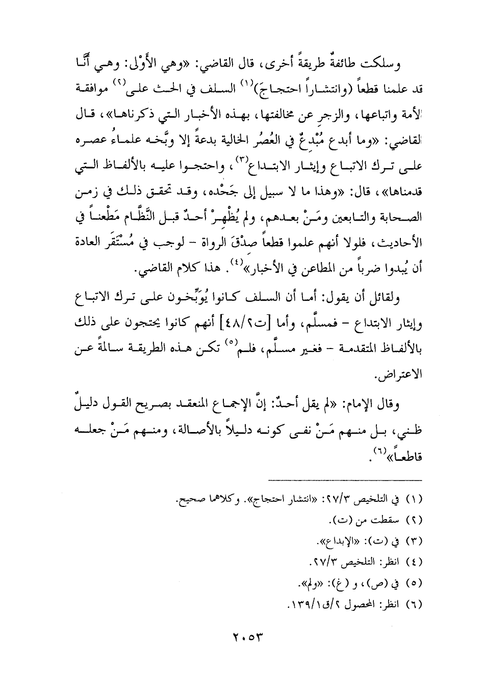 وسلكت طائفةٌ طريقةً أخرى، قال القاضي: "وهي الأَوْلى: وهي أنَّا قد علمنا قطعًا (وانتشارًا احتجاجَ) (¬١) السلف في الحث على (¬٢) موافقة الأمة واتباعها، والزجرِ عن مخالفتها، بهذه الأخبار التي ذكرناها"، قال القاضي: "وما أبدع مُبْدِعٌ في العُصُر الخالية بدعةً إلا وبَّخه علماءُ عصره على ترك الاتباع وإيثار الابتداع (¬٣)، واحتجوا عليه بالألفاظ التي قدمناها"، قال: "وهذا ما لا سبيل إلى جَحْده، وقد تحقق ذلك في زمن الصحابة والتابعين ومَنْ بعدهم، ولم يُظْهِرْ أحدٌ قبل النَّظَّام مَطْعنًا في الأحاديث، فلولا أنهم علموا قطعًا صِدْقَ الرواة - لوجب في مُسْتَقَر العادة أن يُبدوا ضربًا من المطاعن في الأخبار" (¬٤). هذا كلام القاضي.