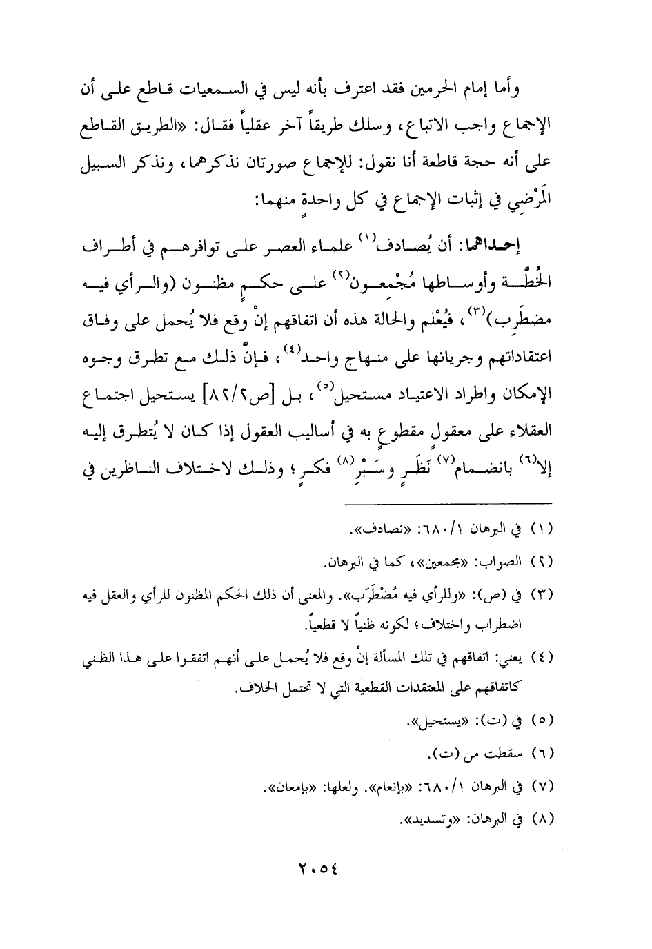 وأما إمام الحرمين فقد اعترف بأنه ليس في السمعيات قاطع على أن الإجماع واجب الاتباع، وسلك طريقًا آخر عقليًا فقال: "الطريق القاطع على أنه حجة قاطعة أنا نقول: للإجماع صورتان نذكرهما، ونذكر السبيل المَرْضِي في إثبات الإجماع في كل واحدةٍ منهما: