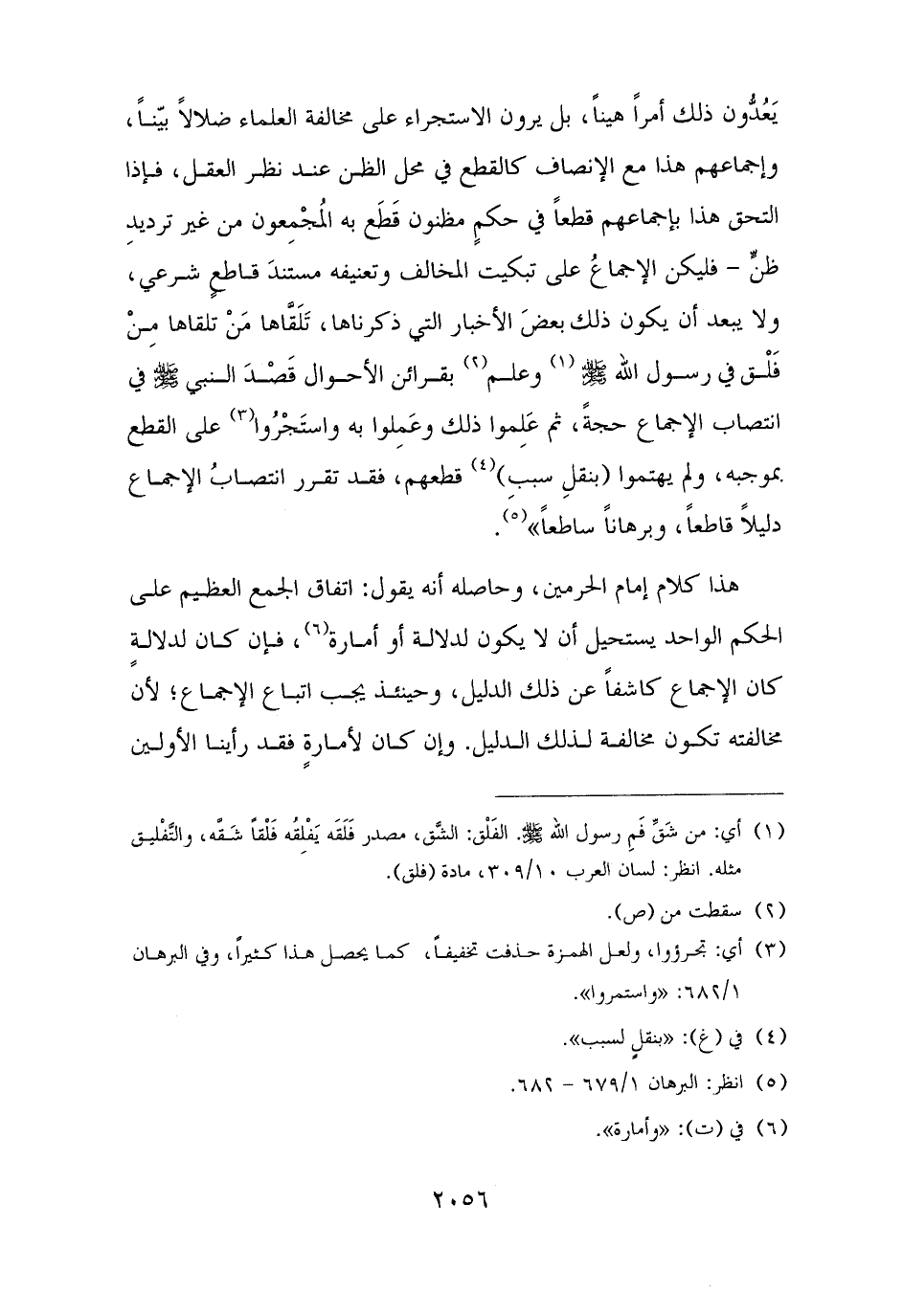 يَعُدُّون ذلك أمرًا هينًا، بل يرون الاستجراء على مخالفة العلماء ضلالًا بيّنًا، وإجماعهم هذا مع الإنصاف كالقطع في محل الظن عند نظر العقل، فإذا التحق هذا بإجماعهم قطعًا في حكمٍ مظنون قَطَع به المُجْمِعون من غير ترديدِ ظنٍّ - فليكن الإجماعُ على تبكيت المخالف وتعنيفه مستندَ قاطعٍ شرعي، ولا يبعد أن يكون ذلك بعضَ الأخبار التي ذكرناها، تَلَقَّاها مَنْ تلقاها مِنْ فَلْق في رسول الله - صلى الله عليه وسلم - (¬١) وعلم (¬٢) بقرائن الأحوال قَصْدَ النبي - صلى الله عليه وسلم - في انتصاب الإجماع حجةً، ثم عَلِموا ذلك وعَمِلوا به واستَجْرُوا (¬٣) على القطع بموجبه، ولم يهتموا (بنقلِ سببِ) (¬٤) قطعهم، فقد تقرر انتصابُ الإجماع دليلًا قاطعًا، وبرهانًا ساطعًا" (¬٥).