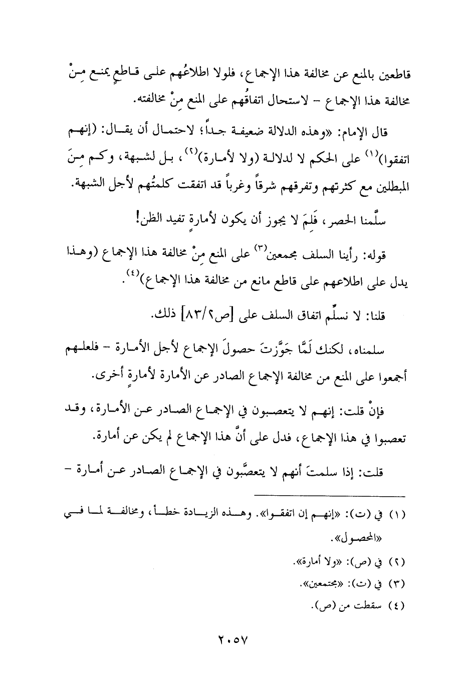 قوله: رأينا السلف مجمعين (¬٣) على المنع مِنْ مخالفة هذا الإجماع (وهذا يدل على اطلاعهم على قاطع مانع من مخالفة هذا الإجماع) (¬٤).