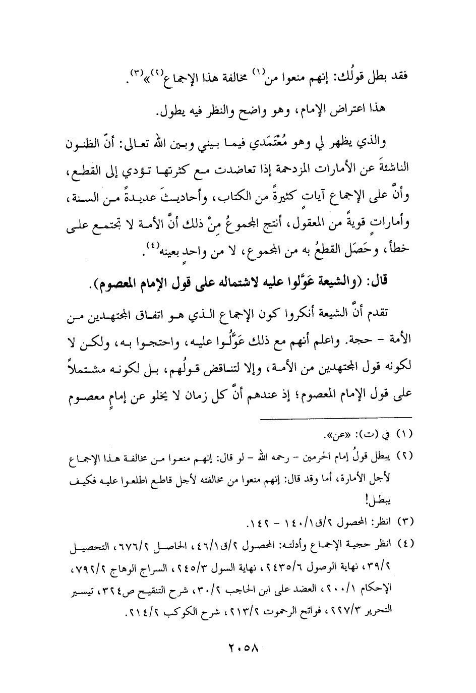 (¬٤) انظر حجية الإجماع وأدلته: المحصول ٢/ ق ١/ ٤٦، الحاصل ٢/ ٦٧٦، التحصيل ٢/ ٣٩، نهاية الوصول ٦/ ٢٤٣٥، نهاية السول ٣/ ٢٤٥، السراج الوهاج ٢/ ٧٩٢، الإحكام ١/ ٢٠٠، العضد على ابن الحاجب ٢/ ٣٠، شرح التنقيح ص ٣٢٤، تيسير التحرير ٣/ ٢٢٧، فواتح الرحموت ٢/ ٢١٣، شرح الكوكب ٢/ ٢١٤.