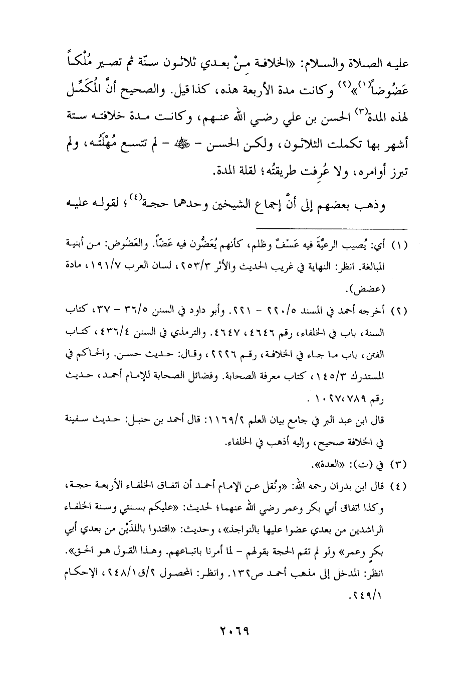 (¬٢) أخرجه أحمد في المسند ٥/ ٢٢٠ - ٢٢١. وأبو داود في السنن ٥/ ٣٦ - ٣٧، كتاب السنة، باب في الخلفاء، رقم ٤٦٤٦، ٤٦٤٧. والترمذي في السنن ٤/ ٤٣٦، كتاب الفتن، باب ما جاء في الخلافة، رقم ٢٢٢٦، وقال: حديث حسن. والحاكم في المستدرك ٣/ ١٤٥، كتاب معرفة الصحابة. وفضائل الصحابة للإمام أحمد، حديث رقم ٧٨٩، ١٠٢٧.