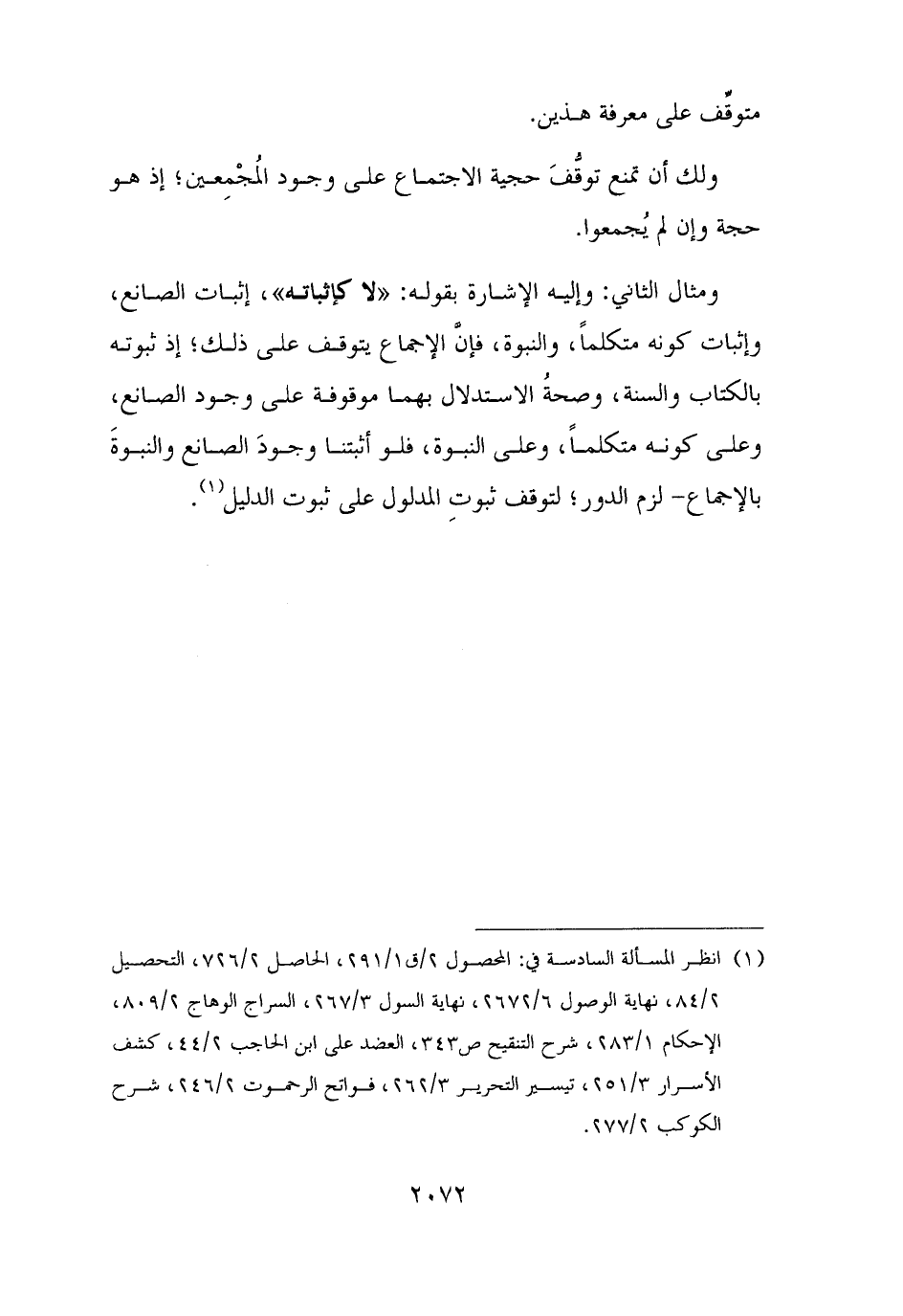 ومثال الثاني: وإليه الإشارة لقوله: "لا كإثباته"، إثبات الصانع، وإثبات كونه متكلمًا، والنبوة، فإنَّ الإجماع يتوقف على ذلك؛ إذ ثبوته بالكتاب والسنة، وصحةُ الاستدلال بهما موقوفة على وجود الصانع، وعلى كونه متكلمًا، وعلى النبوة، فلو أثبتنا وجودَ الصانع والنبوةَ بالإجماع - لزم الدور؛ لتوقف ثبوتِ المدلول على ثبوت الدليل (¬١).