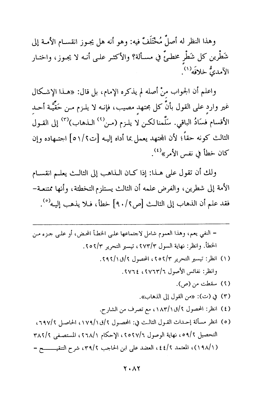 وهذا النظر له أصلٌ مُخْتَلَفٌ فيه: وهو أنه هل يجوز انقسام الأمة إلى شَطْرين كل شَطْرٍ مخطئٌ في مسألة؟ والأكثر على أنه لا يجوز، واختار الآمديُّ خلافَه (¬١).
