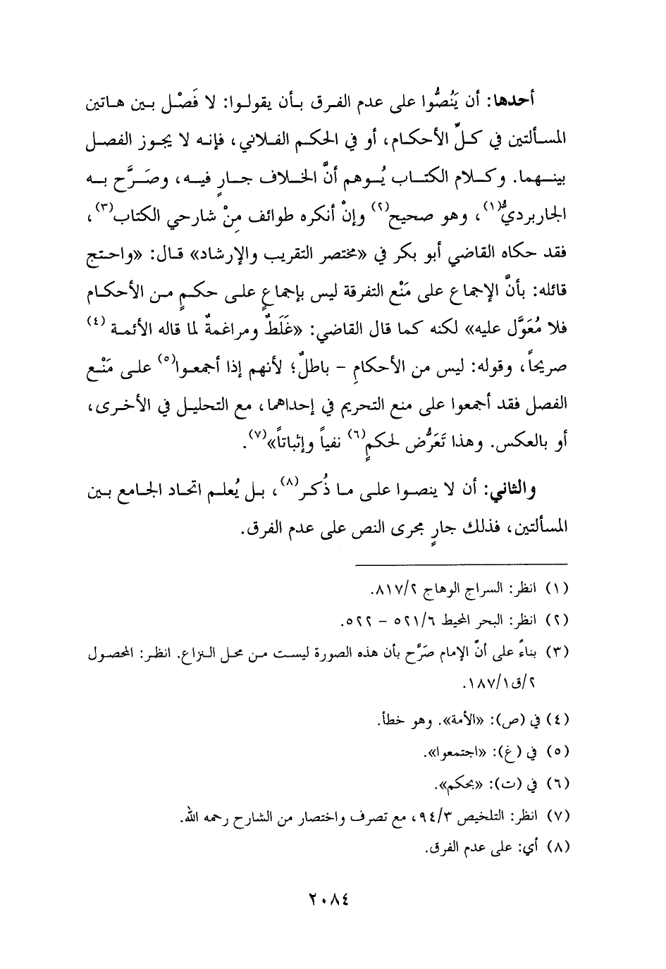 أحدها: أن يَنُصُّوا على عدم الفرق بأن يقولوا: لا فَصْل بين هاتين المسألتين في كلِّ الأحكام، أو في الحكم الفلاني، فإنه لا يجوز الفصل بينهما. وكلام الكتاب يُوهم أنَّ الخلاف جارٍ فيه، وصَرَّح به الجاربرديُّ (¬١)، وهو صحيح (¬٢) وإنْ أنكره طوائف مِنْ شارحي الكتاب (¬٣)، فقد حكاه القاضي أبو بكر في "مختصر التقريب والإرشاد" قال: "واحتج قائله: بأنَّ الإجماع على مَنْع التفرقة ليس بإجماعٍ على حكمٍ من الأحكام فلا مُعَوَّل عليه" لكنه كما قال القاضي: "غَلَطٌ ومراغمةٌ لما قاله الأئمة (¬٤) صريحًا، وقوله: ليس من الأحكامِ - باطلٌ؛ لأنهم إذا أجمعوا (¬٥) على مَنْع الفصل فقد أجمعوا على منع التحريم في إحداهما، مع التحليل في الأخرى، أو بالعكس. وهذا تَعَرُّض لحكمٍ (¬٦) نفيًا وإثباتًا" (¬٧).