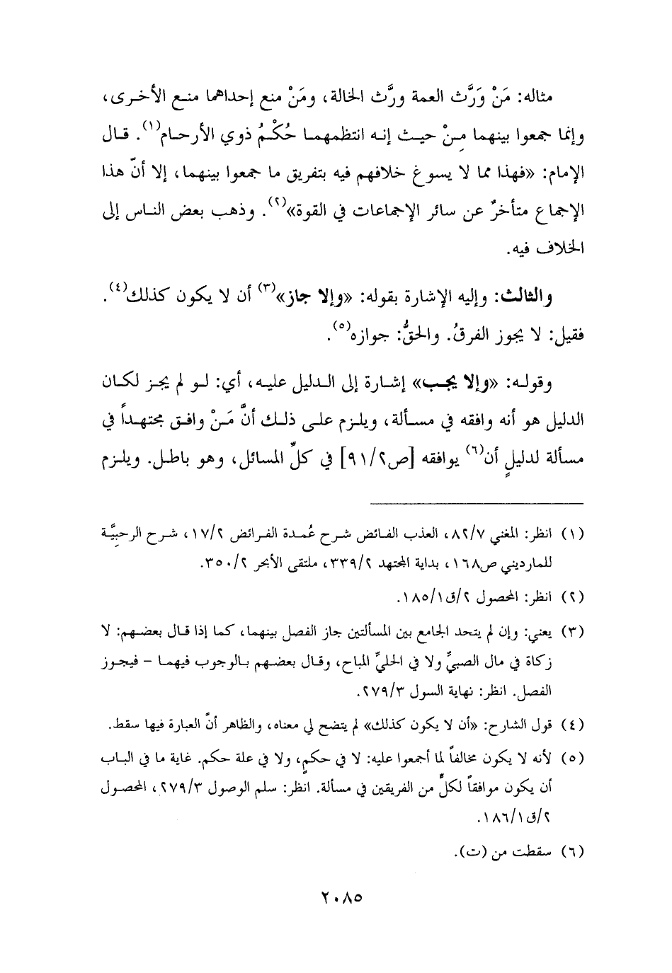 (¬٥) لأنه لا يكون مخالفًا لما أجمعوا عليه: لا في حكمٍ، ولا في علة حكم. غاية ما في الباب أن يكون موافقًا لكل من الفريقين في مسألة. انظر: سلم الوصول ٣/ ٢٧٩، المحصول ٢/ ق ١/ ١٨٦.