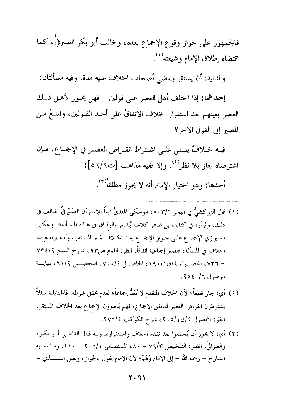(¬٣) أي: لا يجوز أن يُجمعوا بعد تقدم الخلاف واستقراره. وبه قال القاضي أبو بكر، والغزاليّ. انظر: التلخيص ٣/ ٧٩ - ٨٠، المستصفى ١/ ٢٠٥ - ٢١٠. وما نسبه الشارح - رحمه الله - إلى الإمام وَهَمٌ؛ لأن الإمام يقول بالجواز، ولعل الذي =