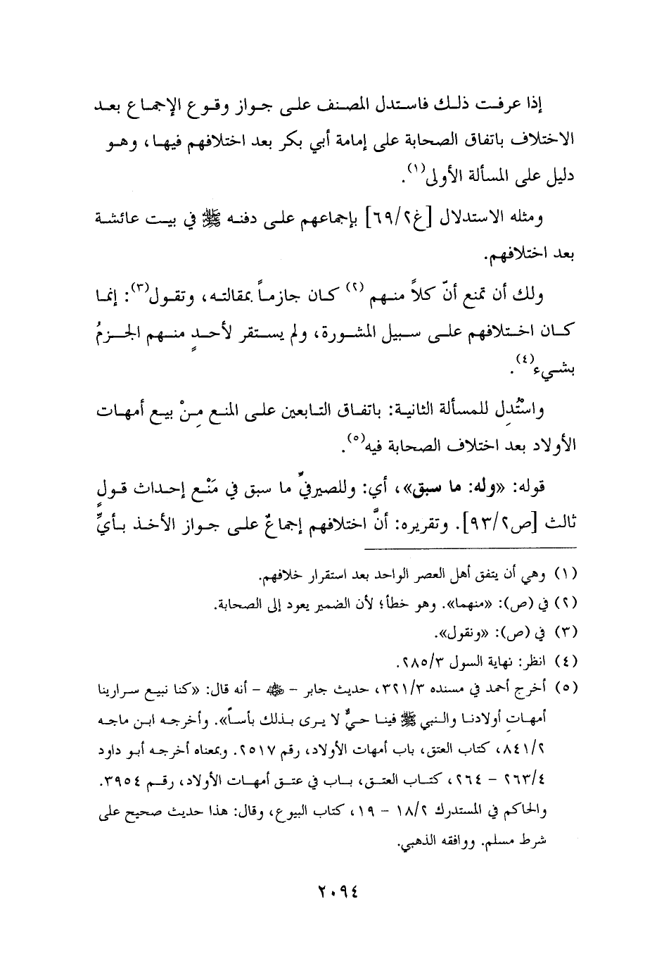(¬٥) أخرج أحمد في مسنده ٣/ ٣٢١، حديث جابر - رضي الله عنه - أنه قال: "كنا نبيع سرارينا أمهاتِ أولادنا والنبي - صلى الله عليه وسلم - فينا حيٌّ لا يرى بذلك بأسًا". وأخرجه ابن ماجه ٢/ ٨٤١، كتاب العتق، باب أمهات الأولاد، رقم ٢٥١٧. وبمعناه أخرجه أبو داود ٤/ ٢٦٣ - ٢٦٤، كتاب العتق، باب في عتق أمهات الأولاد، رقم ٣٩٥٤. والحاكم في المستدرك ٢/ ١٨ - ١٩، كتاب البيوع، وقال: هذا حديث صحيح على شرط مسلم. ووافقه الذهبي.