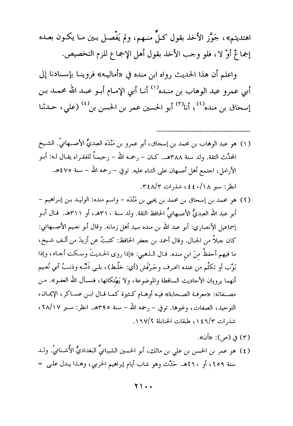 (¬١) هو عبد الوهاب بن محمد بن إسحاق، أبو عمرو بن مَنْدَه العبديُّ الأصبهانيّ، الشيخ المحدِّث الثقة. ولد سنة ٣٨٨ هـ. كان - رحمه الله - رحيمًا للفقراء يقال له: أبو الأرامل، اجتمع أهل أصبهان على الثناء عليه. توفي - رحمه الله - سنة ٤٧٥ هـ.
