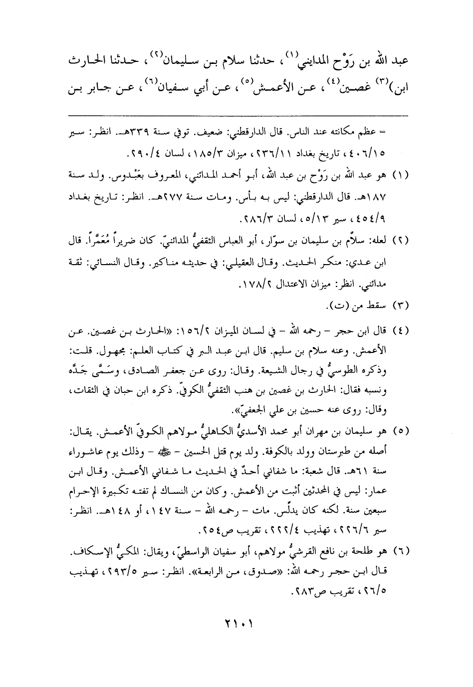 عبد الله بن رَوْح المدايني (¬١)، حدثنا سلام بن سليمان (¬٢)، حدثنا الحارث ابن) (¬٣) غصين (¬٤)، عن الأعمش (¬٥)، عن أبي سفيان (¬٦)، عن جابر بن