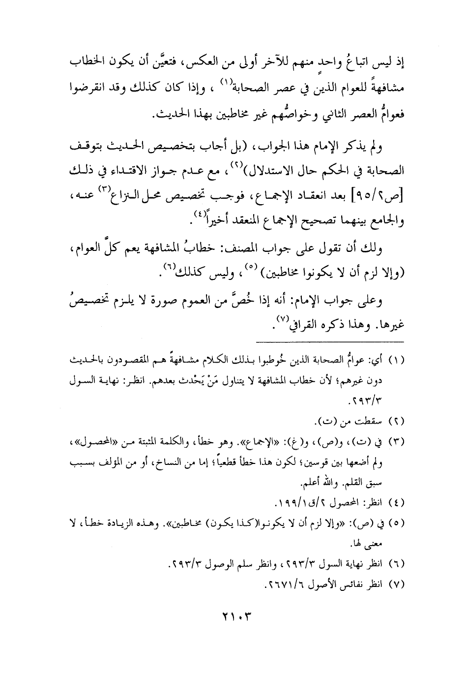 (¬١) أي: عوامُّ الصحابة الذين خُوطبوا بذلك الكلام مشافهةً هم المقصودون بالحديث دون غيرهم؛ لأن خطاب المشافهة لا يتناول مَنْ يَحْدث بعدهم. انظر: نهاية السول ٣/ ٢٩٣.