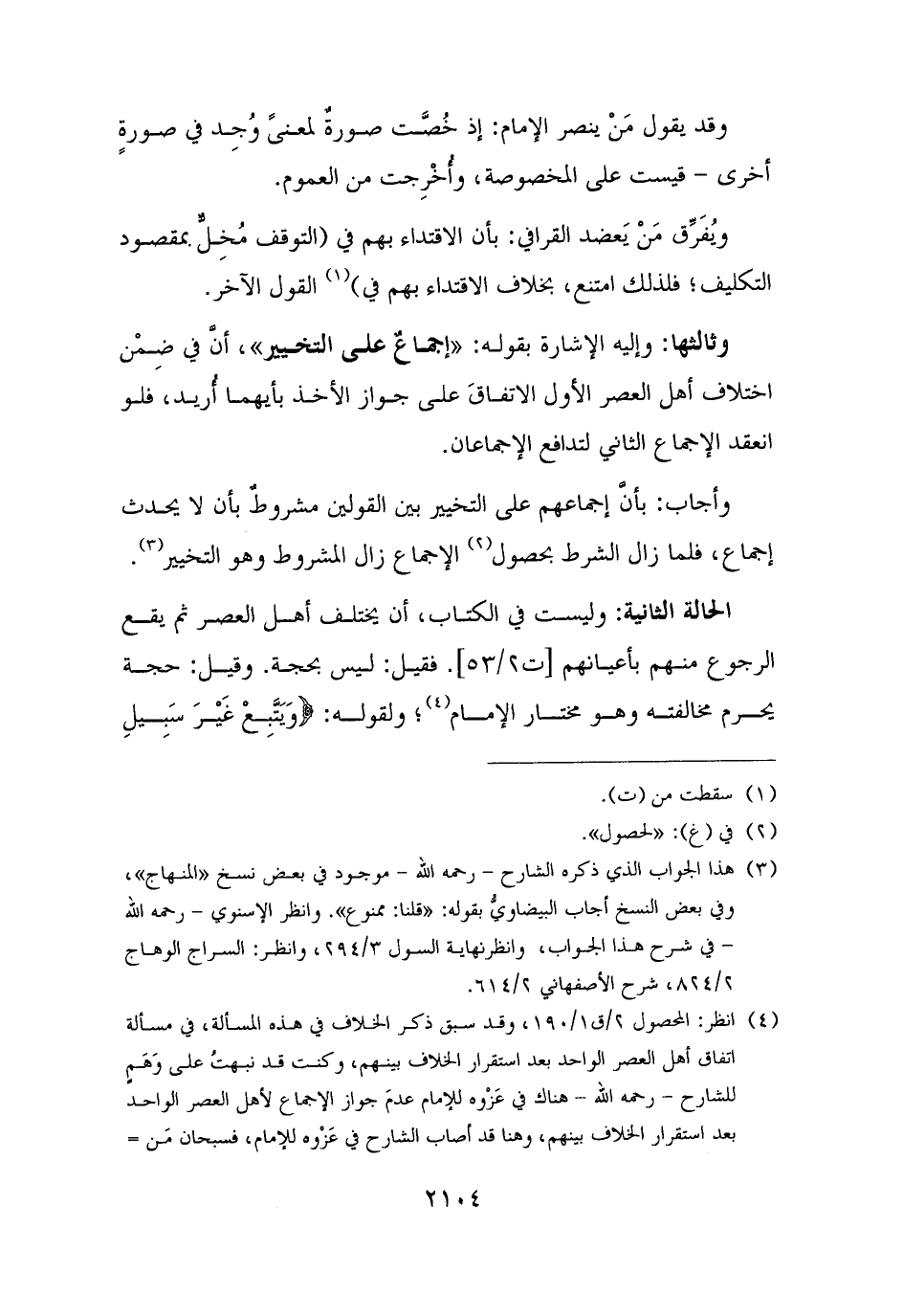 الحالة الثانية: وليست في الكتاب، أن يختلف أهل العصر ثم يقع الرجوع منهم بأعيانهم. فقيل: ليس بحجة. وقيل: حجة يحرم مخالفته وهو مختار الإمام (¬٤)؛ ولقوله: {وَيَتَّبِعْ غَيْرَ سَبِيلِ