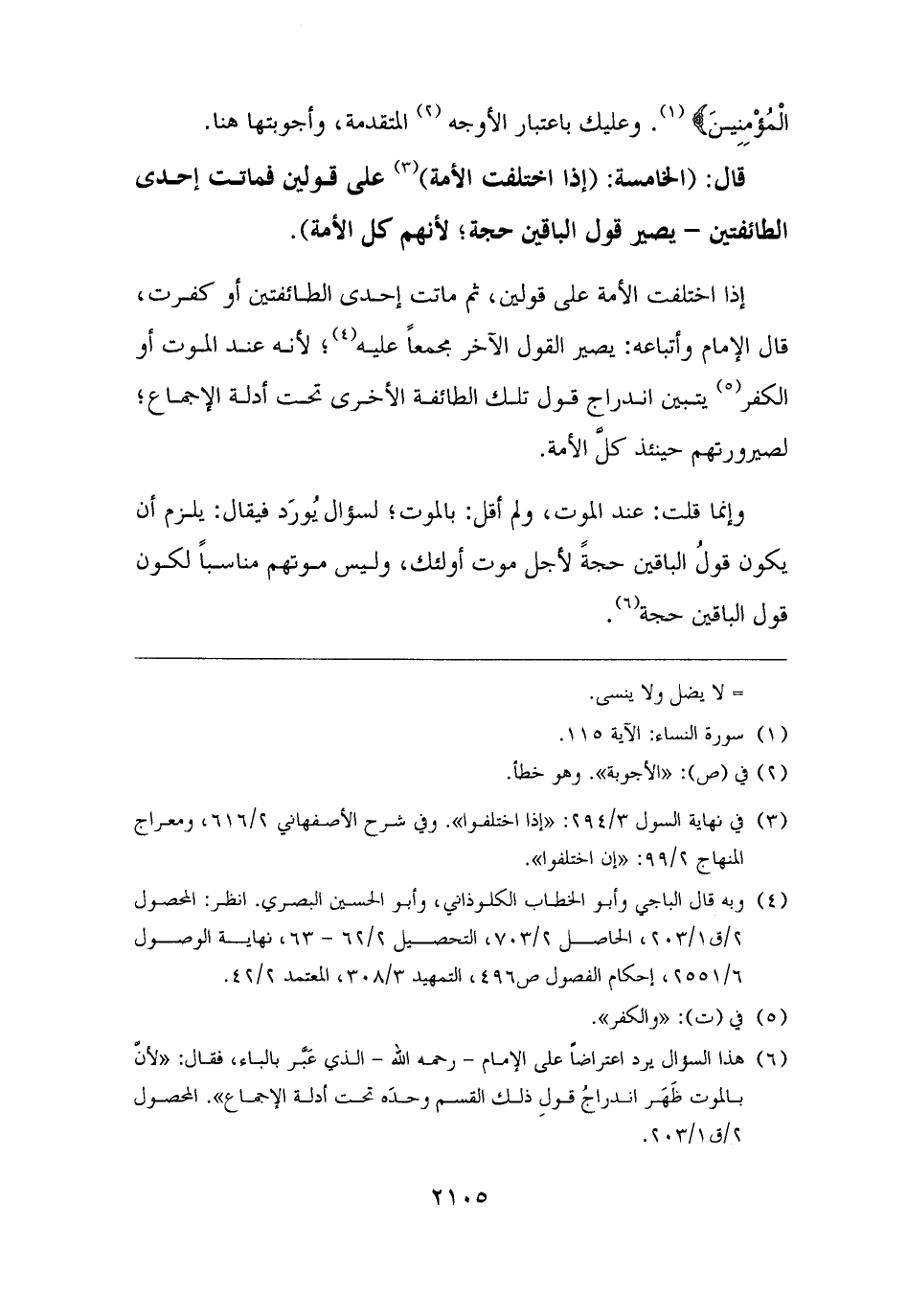 قال: (الخامسة: (إذا اختلفت الأمة) (¬٣) على قولين فماتت إحدى الطائفتين - يصير قول الباقين حجة؛ لأنهم كل الأمة).