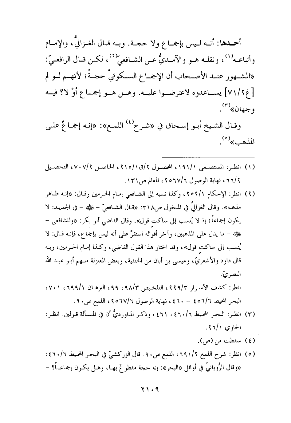 (¬٥) انظر: شرح اللمع ٢/ ٦٩١، اللمع ص ٩٠. قال الزركشيّ في البحر المحيط ٦/ ٤٦٠: "وقال الرُّويانيّ في أوائل "البحر": إنه حجة مقطوعٌ بها، وهل يكون إجماعًا؟ =
