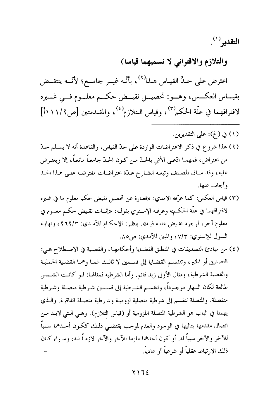(¬٢) هذا شروع في ذكر الاعتراضات الواردة على حدّ القياس، والقاعدة أنه لا يسلم حدّ من اعتراض، فمهما ادّعى الآتي بالحدّ من كون الحدّ جامعًا مانعًا، إلا ويعترض عليه، وقد ساق المصنف وتبعه الشارح عدَّة اعتراضات مفترضة على هذا الحد وأجاب عنها.