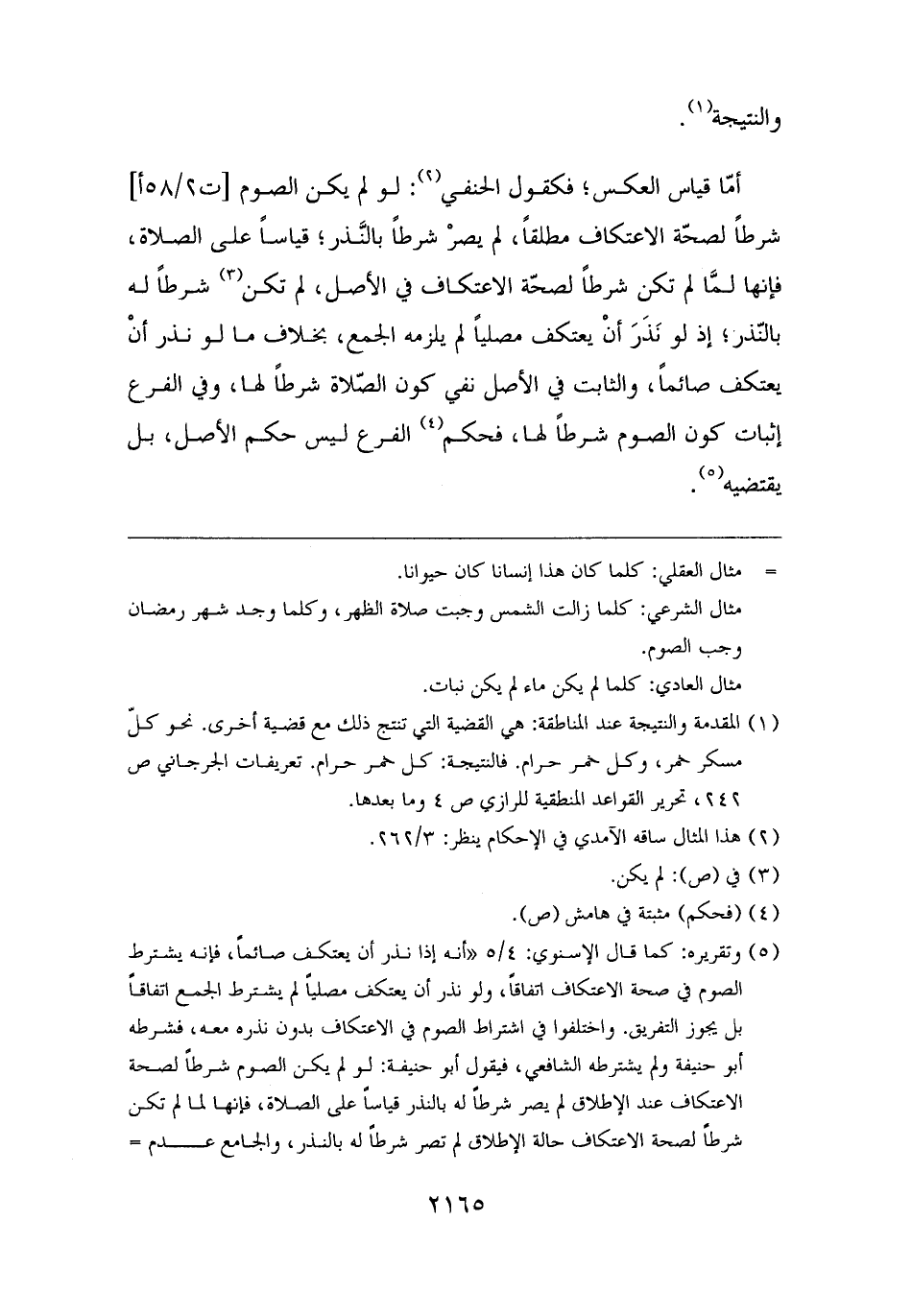 أمّا قياس العكس، فكقول الحنفي (¬٢): لو لم يكن الصوم شرطًا لصحّة الاعتكاف مطلقًا، لم يصرْ شرطًا بالنَّذر؛ قياسًا على الصلاة، فإنها لمَّا لم تكن شرطًا لصحّة الاعتكاف في الأصل، لم تكن (¬٣) شرطًا له بالنّذر؛ إذ لو نَذَرَ أنْ يعتكف مصليًا لم يلزمه الجمع، بخلاف ما لو نذر أنْ يعتكف صائمًا، والثابت في الأصل نفي كون الصّلاة شرطًا لها، وفي الفرع إثبات كون الصوم شرطًا لها، فحكم (¬٤) الفرع ليس حكم الأصل، بل يقتضيه (¬٥).