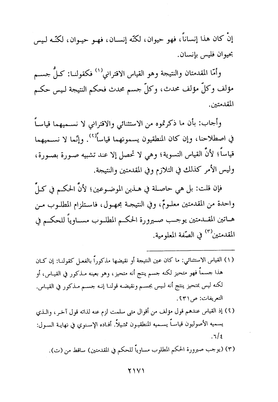وأجاب: بأن ما ذكرتموه من الاستثنائي والاقتراني لا نسميهما قياسًا في اصطلاحنا، وإن كان المنطقيون يسمونهما قياسًا (¬٢). وإنّما لا نسميهما قياسًا؛ لأنَّ القياس التسوية؛ وهى لا تحصل إلا عند تشبيه صورة بصورة، وليس الأمر كذلك في التلازم وفي المقدمتين والنتيجة.