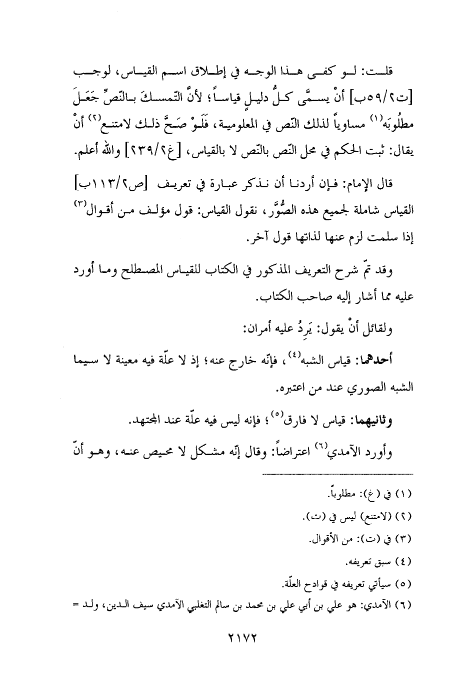 قلت: لو كفى هذا الوجه في إطلاق اسم القياس، لوجب أنْ يسمَّى كلُّ دليلٍ قياسًا؛ لأنَّ التّمسك بالنّصِّ جَعَلَ مطلُوبَه (¬١) مساويًا لذلك النّص في المعلومية، فَلَوْ صَحَّ ذلك لامتنع (¬٢) أنْ يقال: ثبت الحكم في محل النّص بالنّص لا بالقياس، والله أعلم.