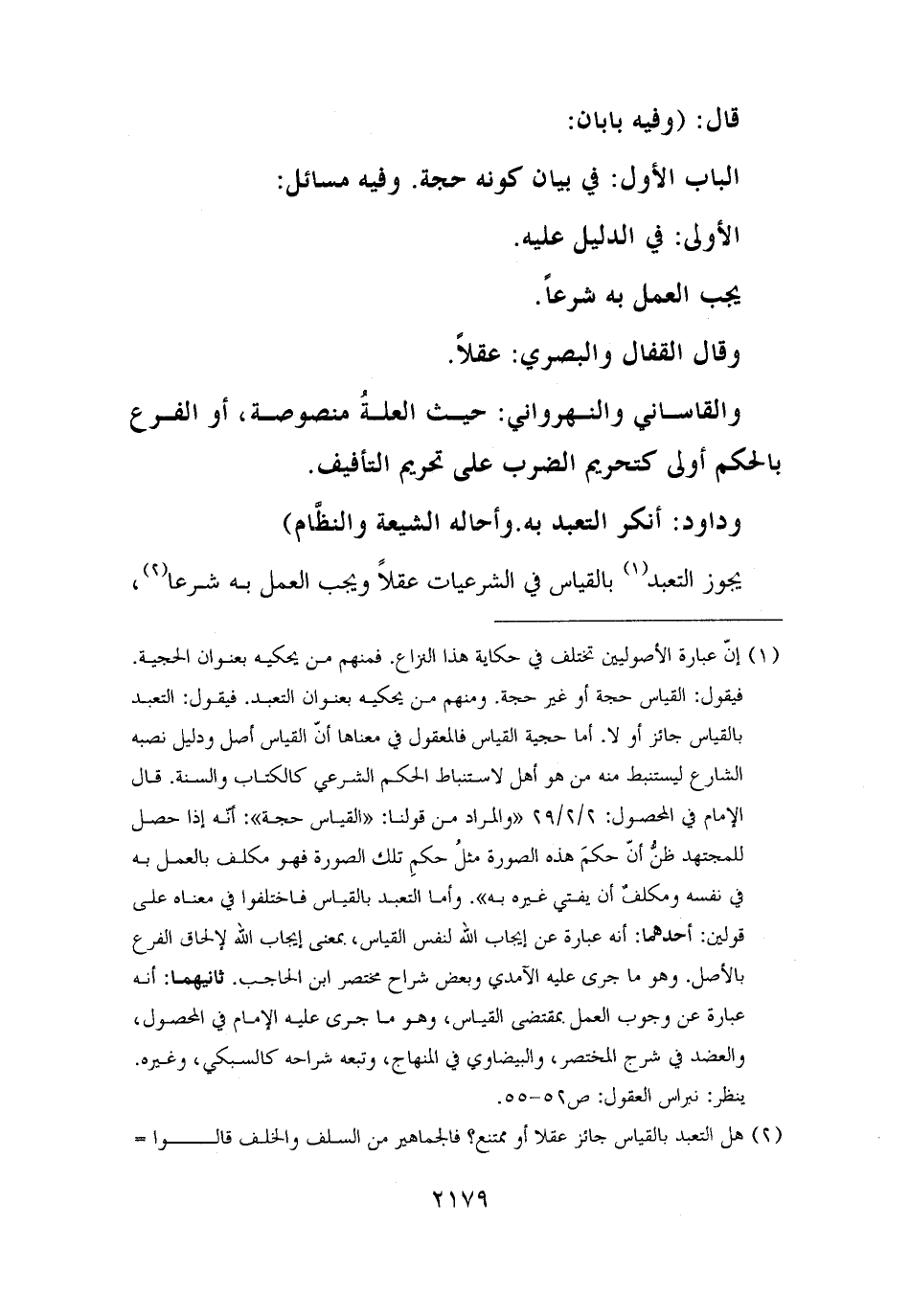 (¬١) إنّ عبارة الأصوليين تختلف في حكاية هذا النزاع. فمنهم من يحكيه بعنوان الحجية. فيقول: القياس حجة أو غير حجة. ومنهم من يحكيه بعنوان التعبد. فيقول: التعبد بالقياس جائز أو لا. أما حجية القياس فالمعقول في معناها أنّ القياس أصل ودليل نصبه الشارع ليستنبط منه من هو أهل لاستنباط الحكم الشرعي كالكتاب والسنة. قال الإمام في المحصول: ٢/ ٢/ ٢٩ "والمراد من قولنا: "القياس حجة": أنَّه إذا حصل للمجتهد ظنُّ أنّ حكمَ هذه الصورة مثلُ حكمِ تلك الصورة فهو مكلف بالعمل به في نفسه ومكلفٌ أن يفتي غيره به". وأما التعبد بالقياس فاختلفوا في معناه على قولين: أحدهما: أنه عبارة عن إيجاب الله لنفس القياس، بمعنى إيجاب الله لإلحاق الفرع بالأصل. وهو ما جرى عليه الآمدي وبعض شراح مختصر ابن الحاجب. ثانيهما: أنه عبارة عن وجوب العمل بمقتضى القياس، وهو ما جرى عليه الإمام في المحصول، والعضد في شرح المختصر، والبيضاوي في المنهاج، وتبعه شراحه كالسبكي، وغيره. ينظر: نبراس العقول: ص ٥٢ - ٥٥.